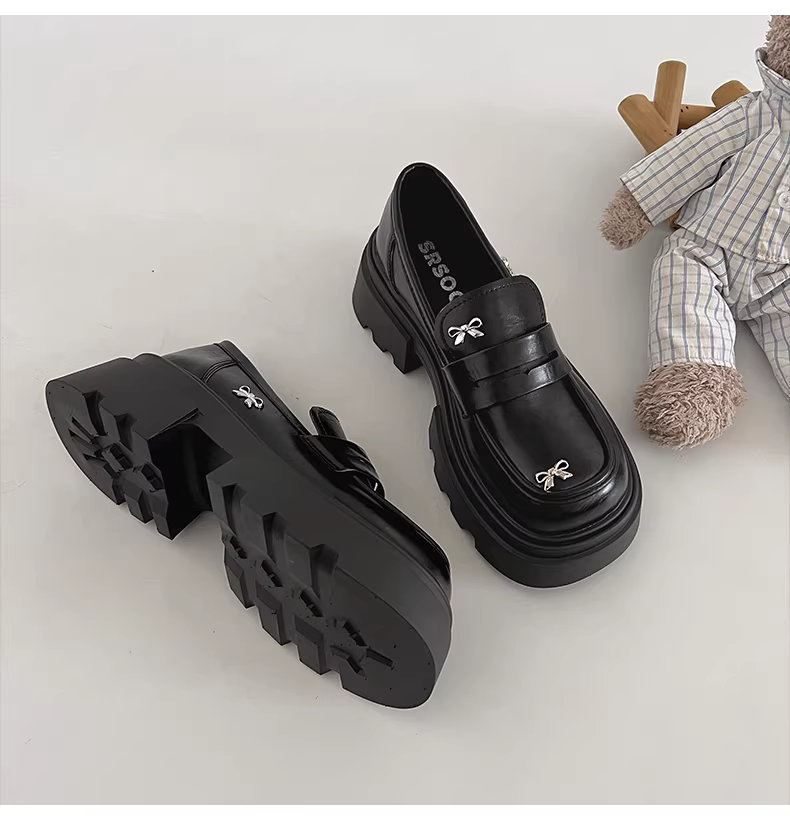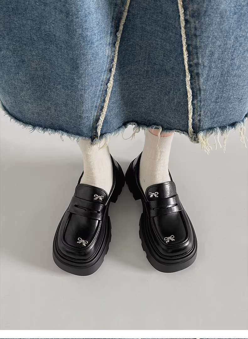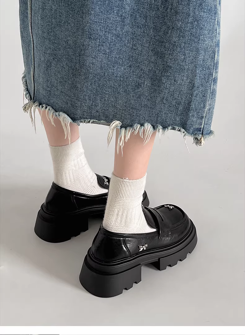 - Giày da nữ đế dày kiểu Anh đen, gót thô, mùa thu mới 2025, kiểu retro Pháp, kiểu lười