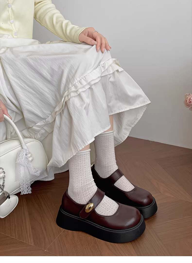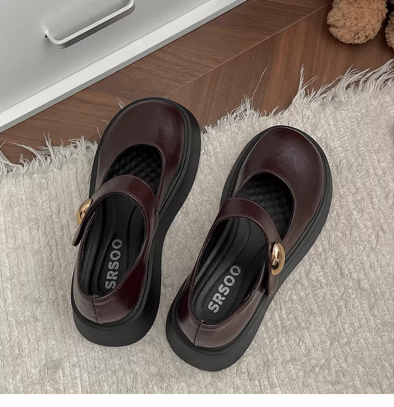 - Giày da nữ đế dày kiểu Anh đen, mũi tròn, tăng chiều cao, kiểu mới thu 2025, phối chân váy, kiểu Mary Jane