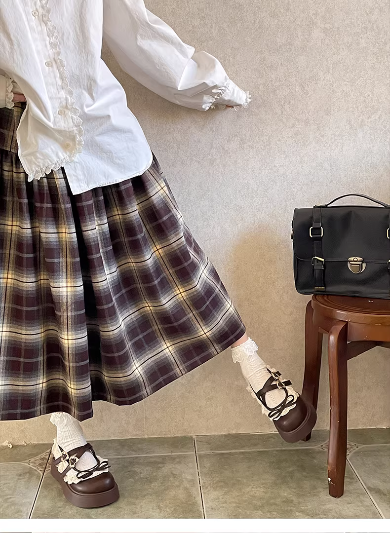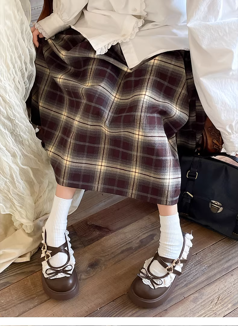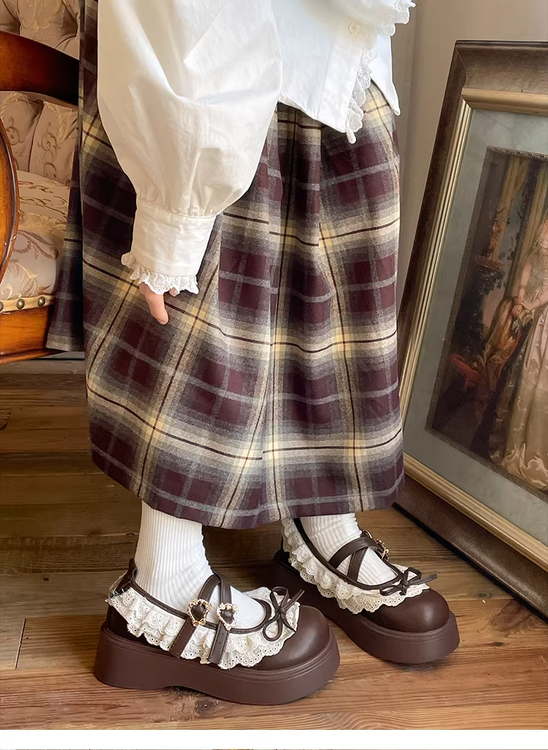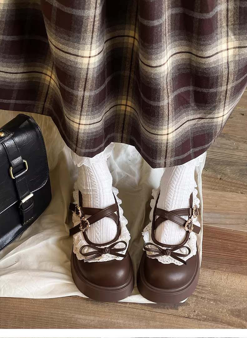 - Giày da nữ đế dày kiểu retro màu nâu, phong cách thu đông 2025 mới, phối cùng chân váy, kiểu giày Mary Jane Pháp.