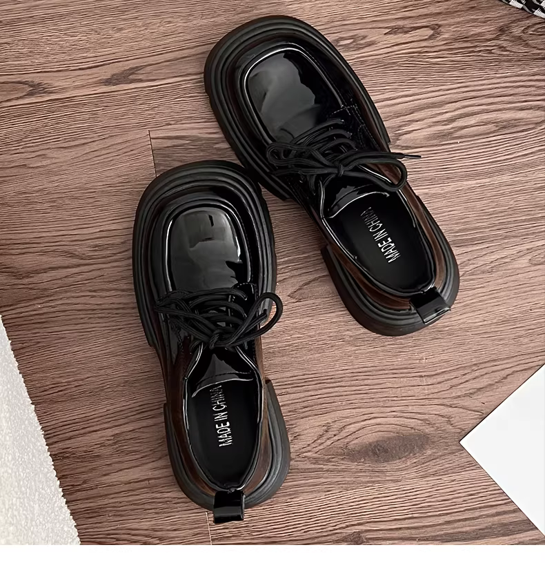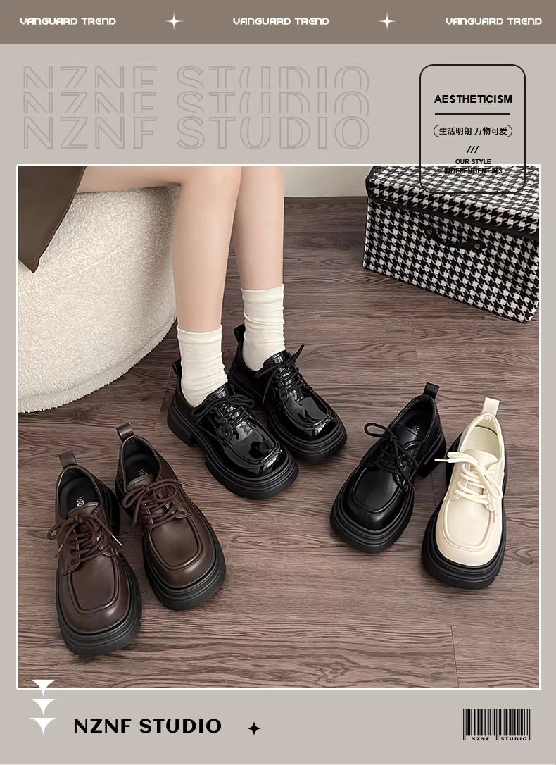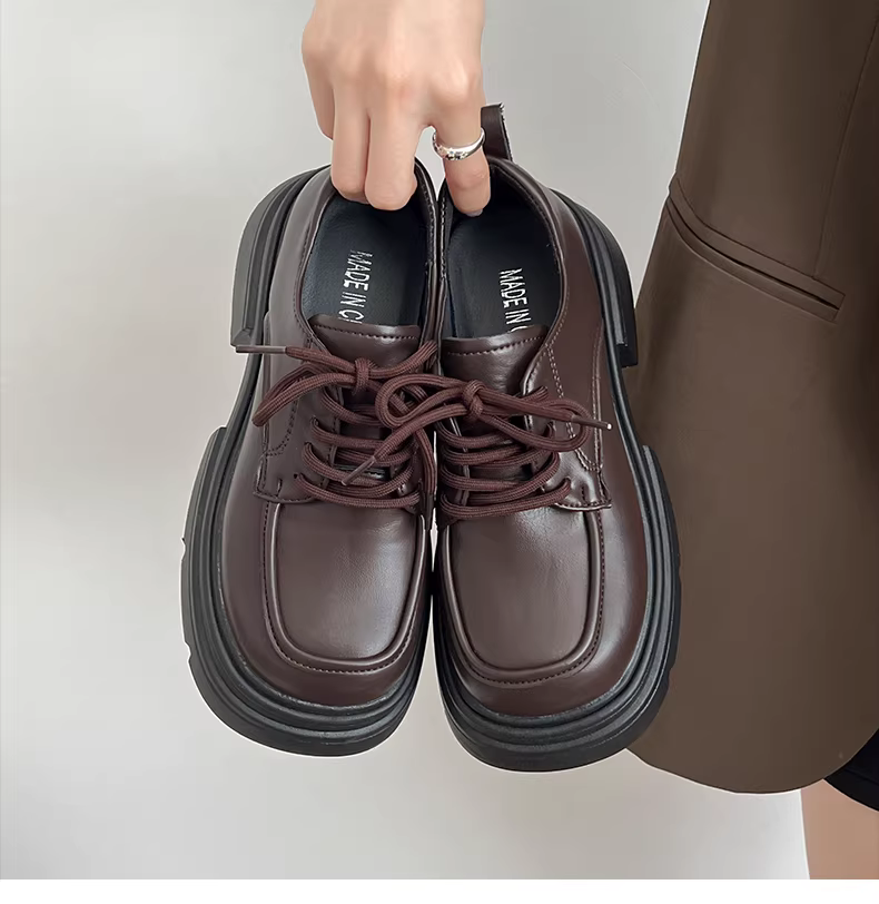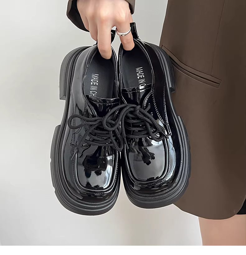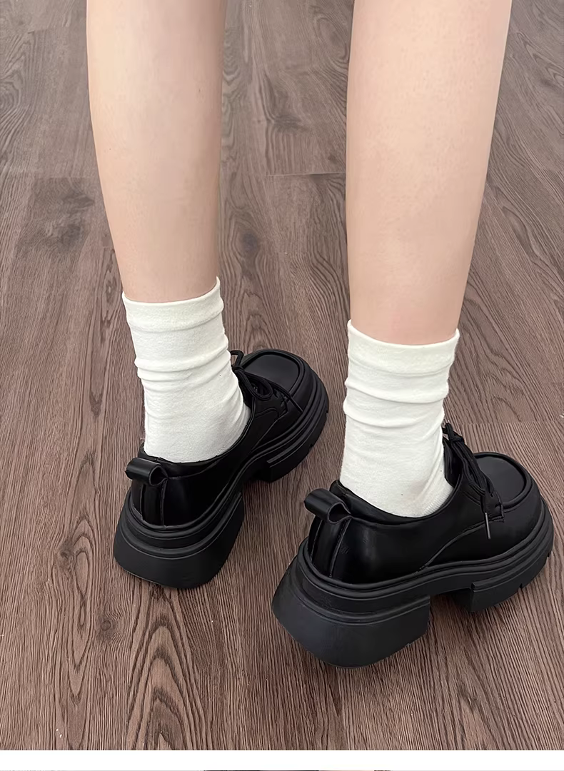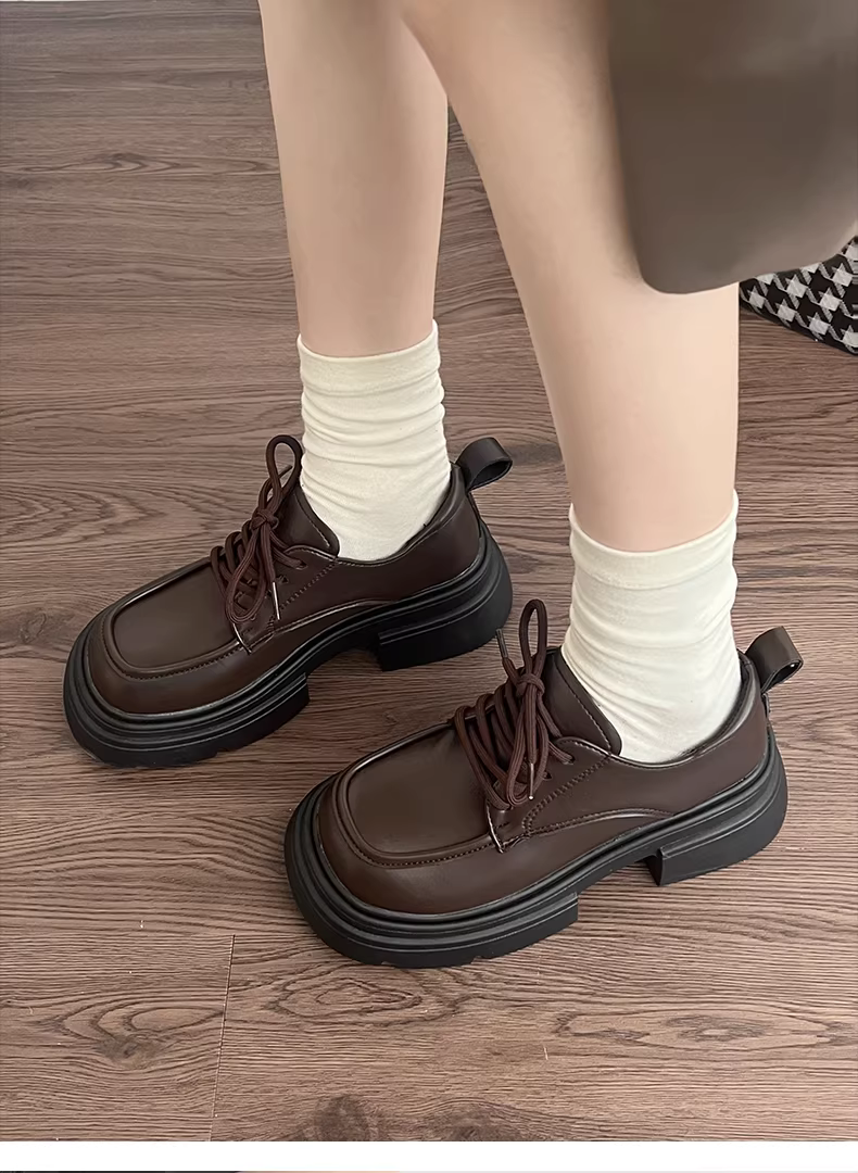 Giày da nữ đế dày phong cách Anh quốc đa năng màu đen, kiểu mới thu đông 2025, gót dày, buộc dây, tăng chiều cao, kiểu retro, giày đơn.