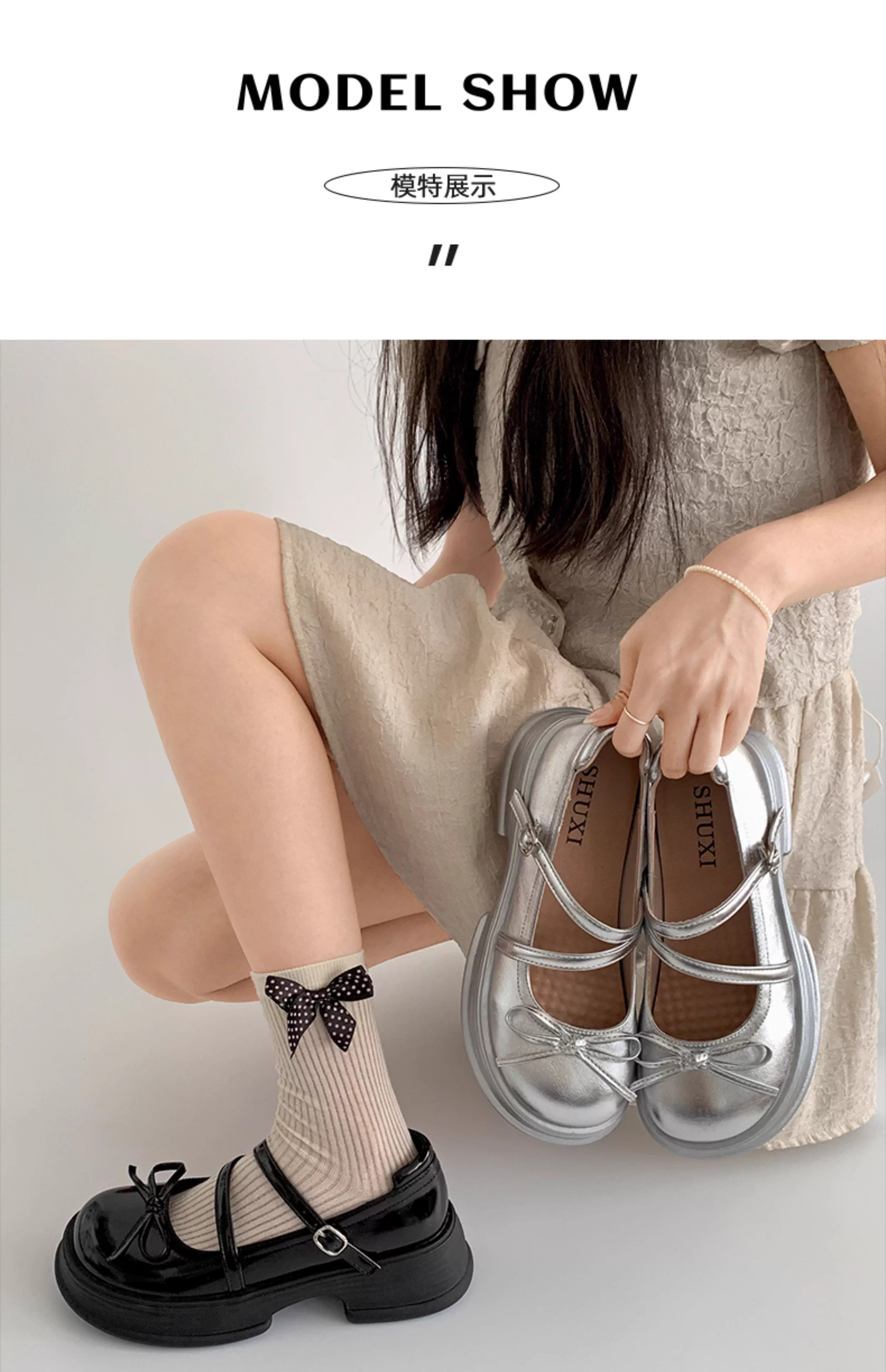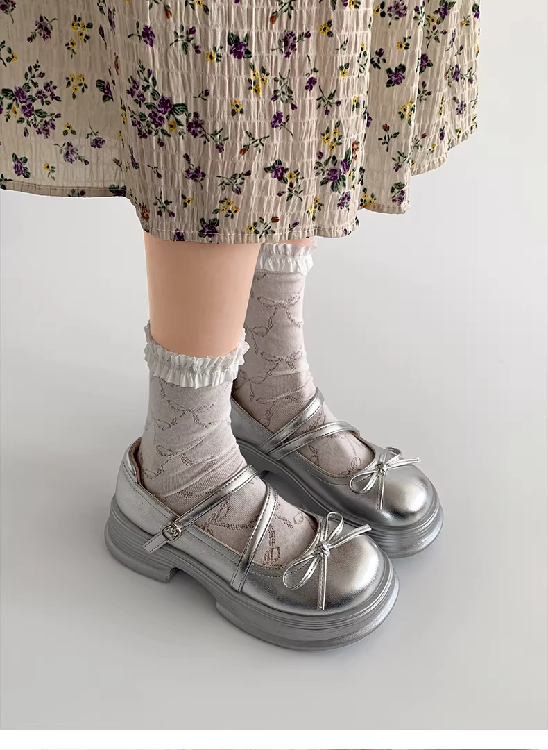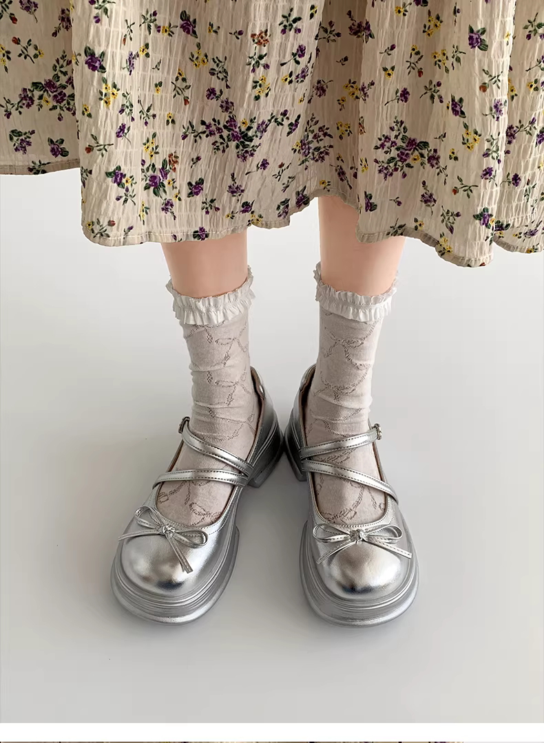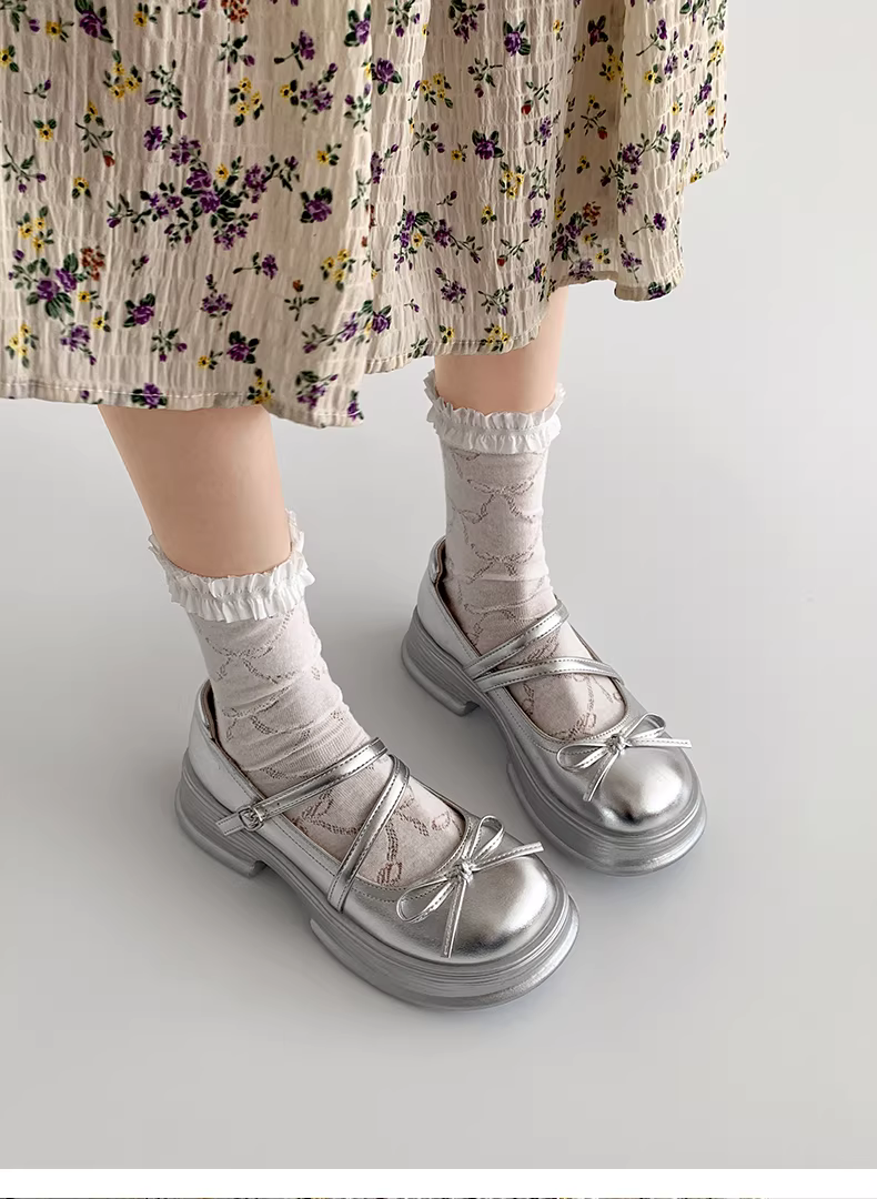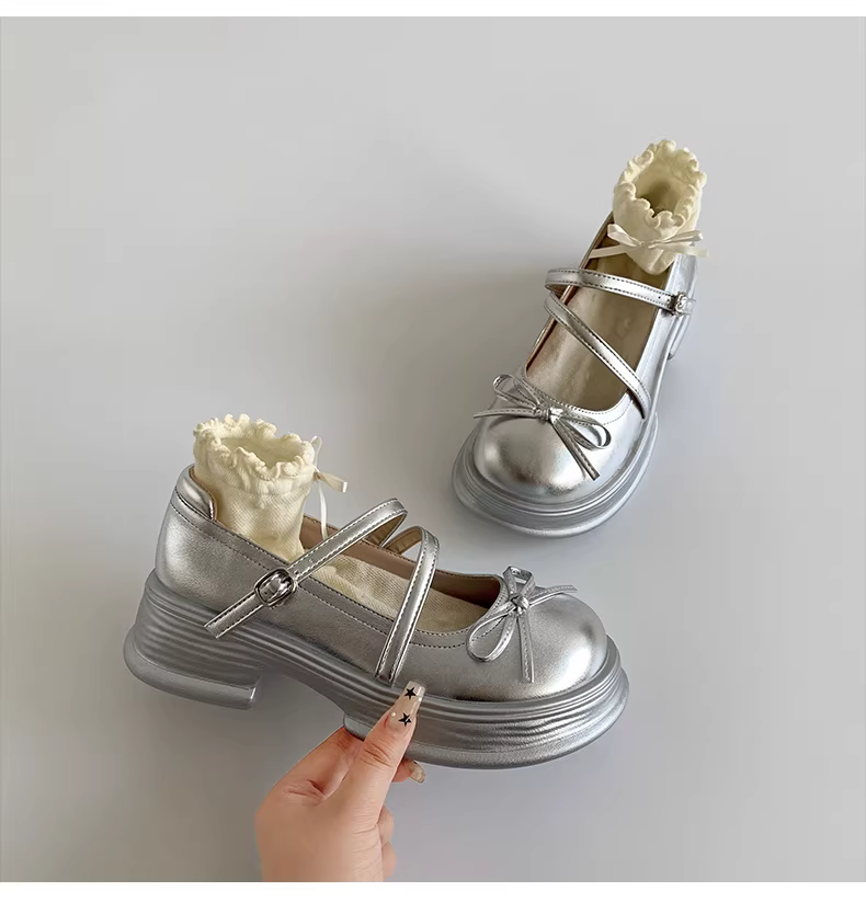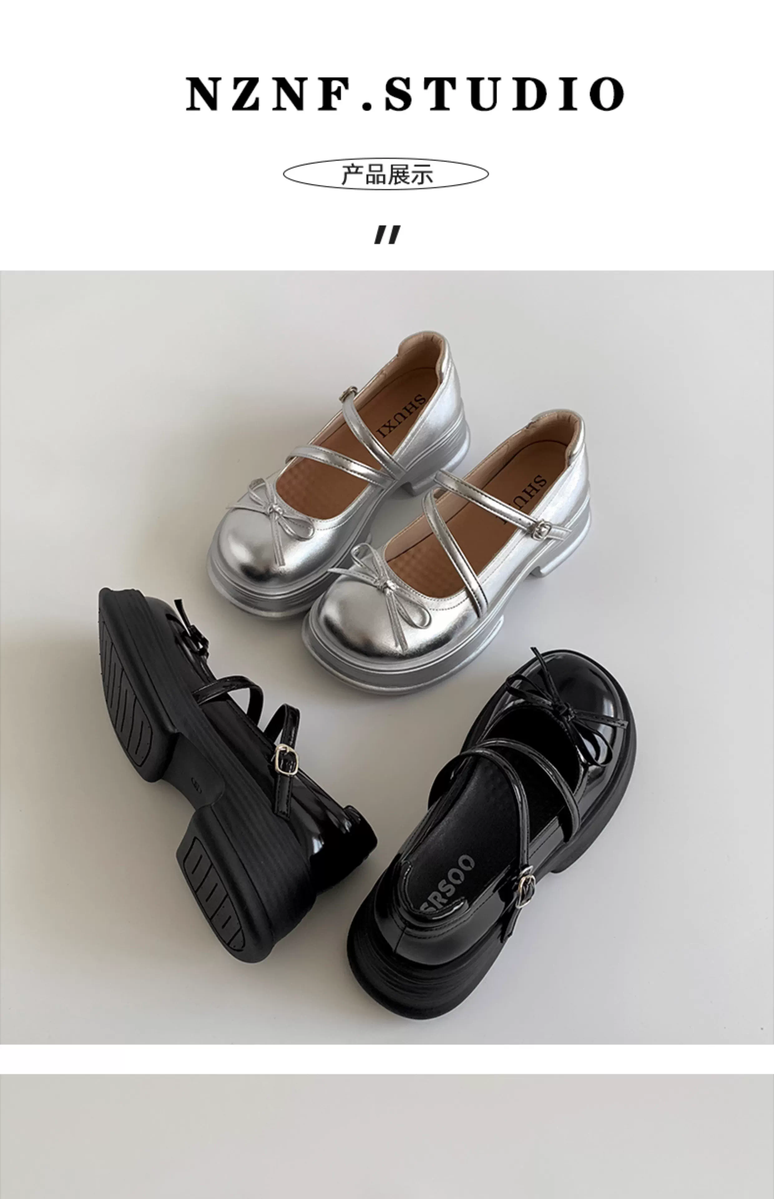 - Giày da nữ đế dày phong cách retro Anh quốc cao cấp màu bạc, kiểu dáng mùa thu mới 2025, phối chân váy, kiểu Mary Jane