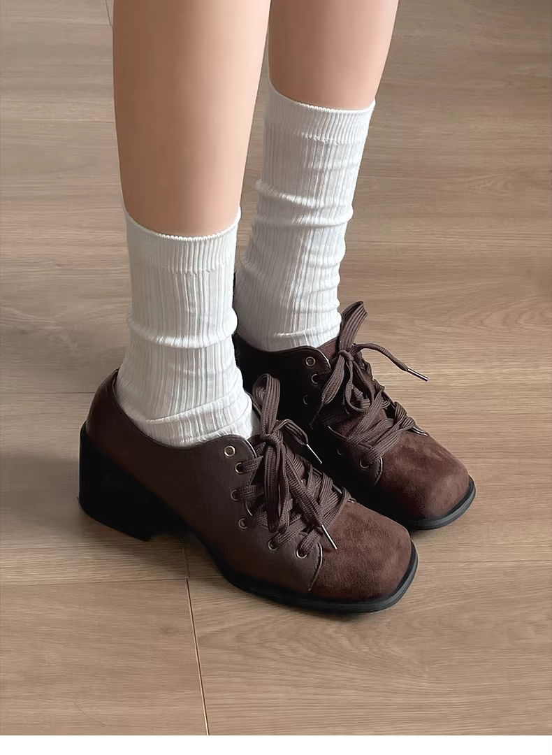Giày da nữ đế thô, mũi vuông, kiểu Anh, tăng chiều cao, buộc dây, màu trắng, mùa thu 2025, kiểu cổ điển, phối chân váy