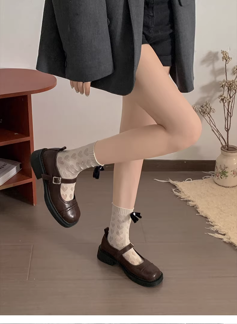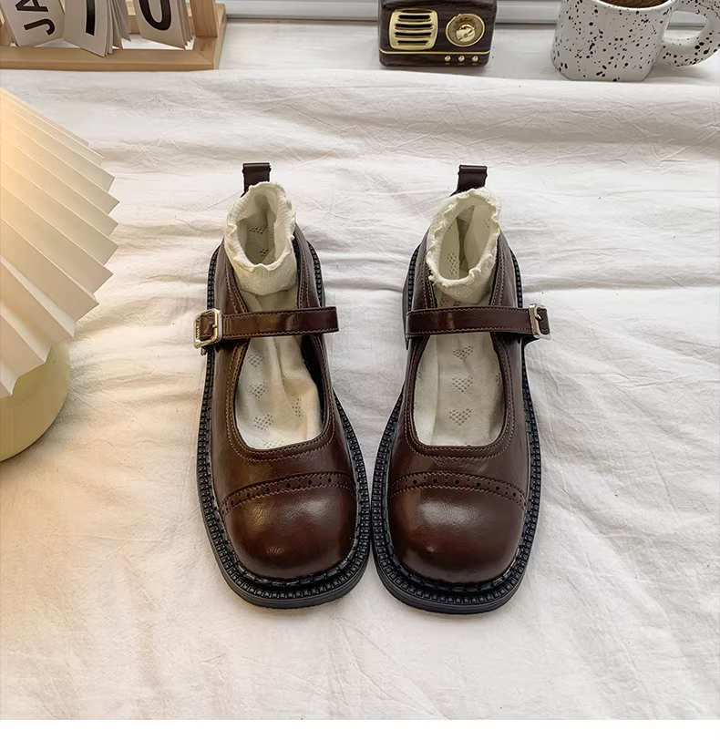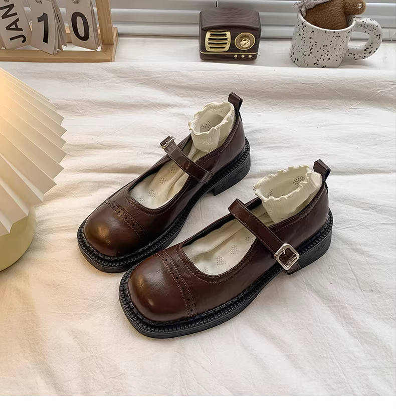 - Giày da nữ kiểu Anh cổ điển, gót thô, mùa thu năm 2025, phối chân váy, kiểu Mary Jane đế thấp