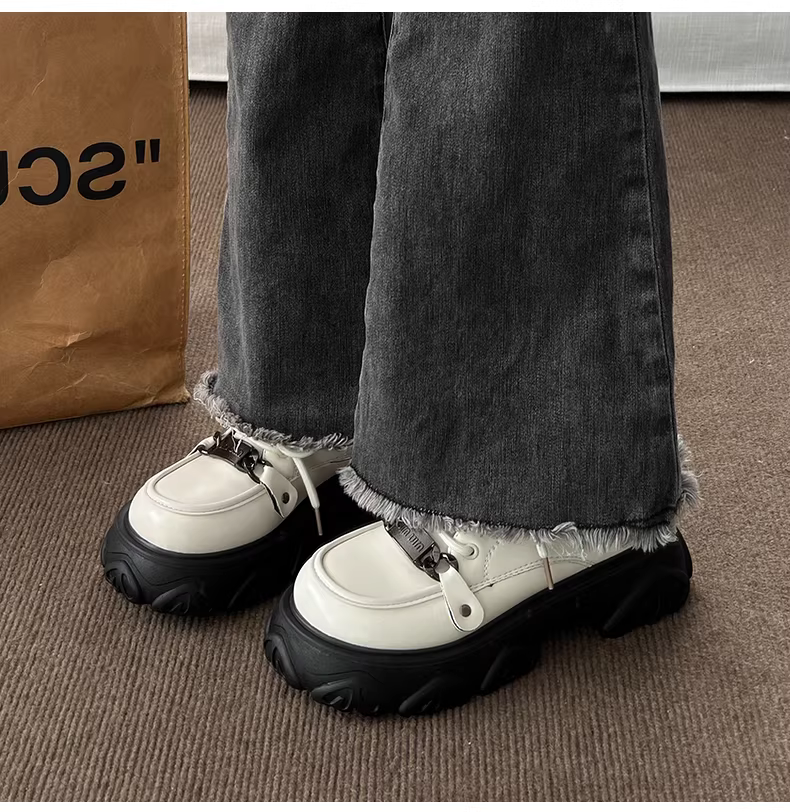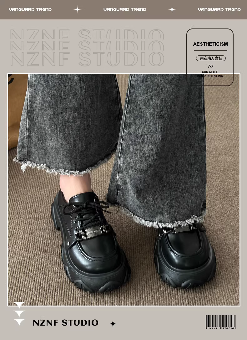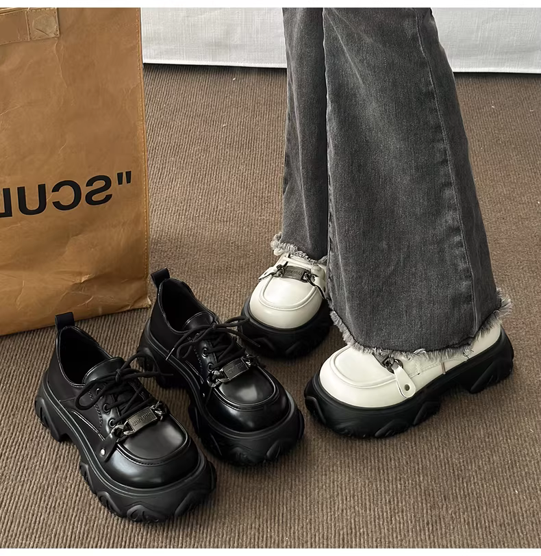 Giày da nữ kiểu Anh cổ điển mũi tròn, mùa thu 2025, kiểu dáng đa năng, màu đen, đế dày, gót vuông, kiểu Mary Jane