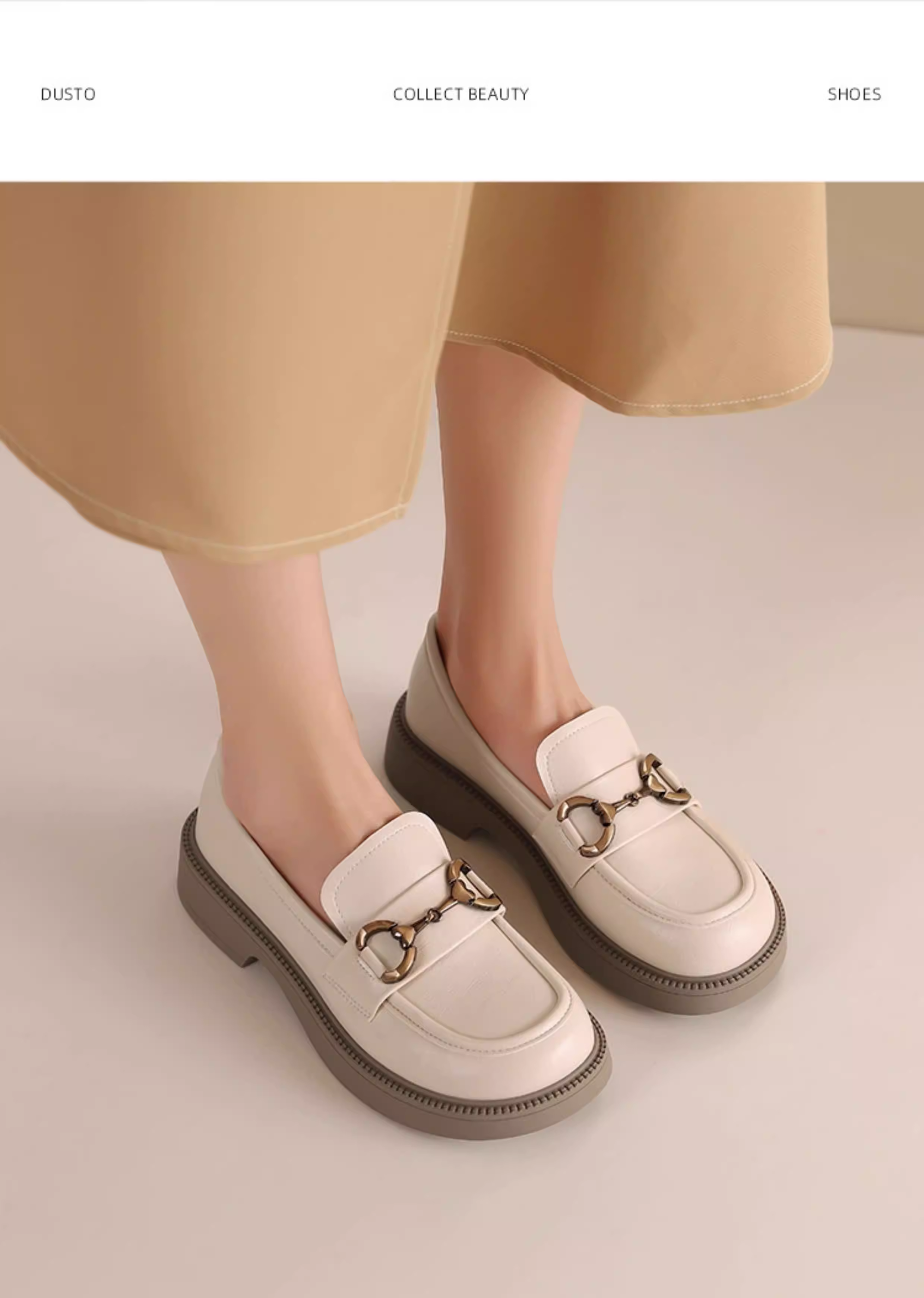 Giày da trắng Dadong dành cho nữ 2025, mẫu mới thu đông, mũi tròn, đa năng, giày đơn đế dày, kiểu lười, giày nữ