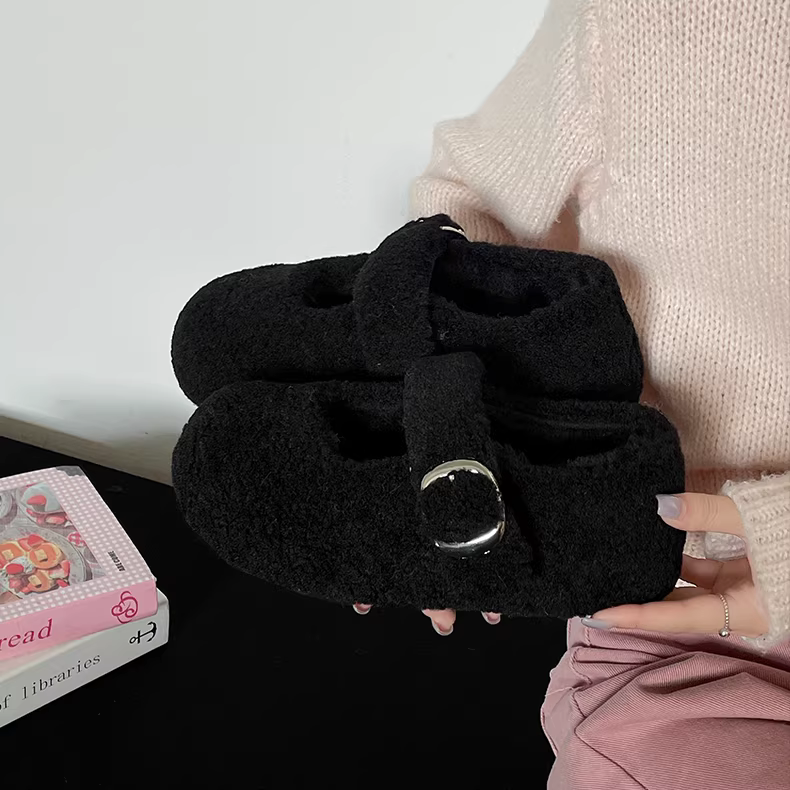 Giày lông dày đế dày phong cách retro màu trắng dành cho nữ, kiểu mới mùa đông 2025, thích hợp phối với chân váy, đế mềm, lót lông cừu.