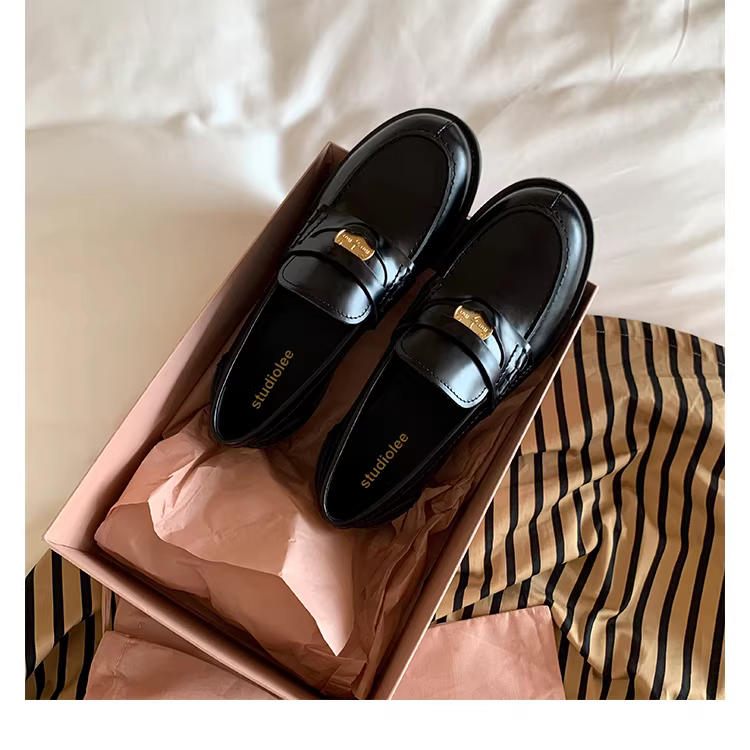 Giày lười đế dày dành cho nữ, giày da nhỏ kiểu Anh, giày đơn mũi tròn xuân thu, da thật, giày kiểu học sinh trượt ngang kiểu JK.