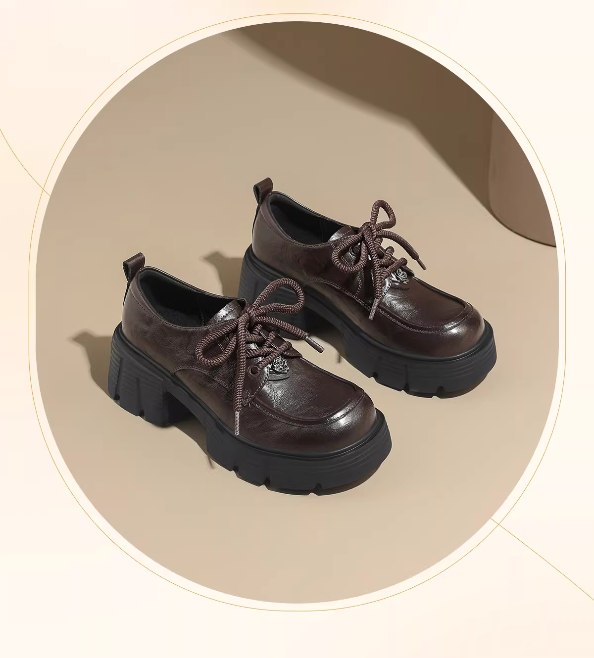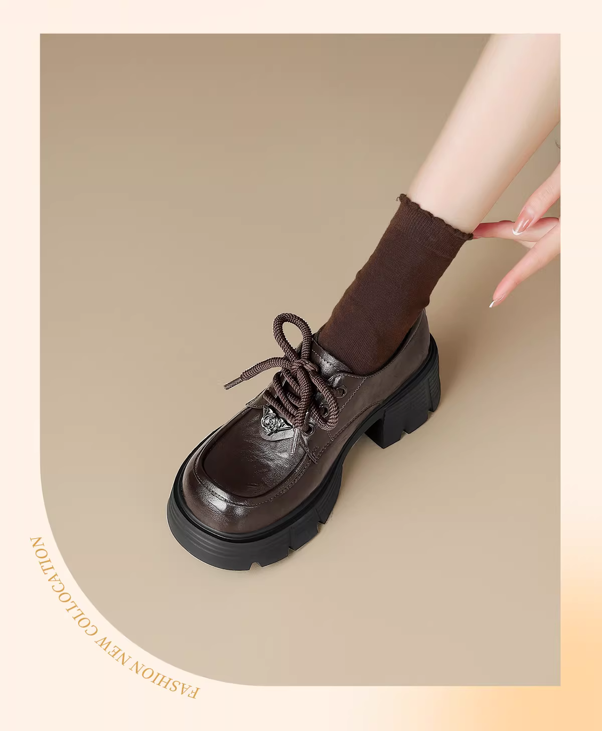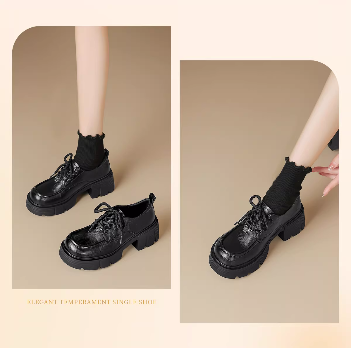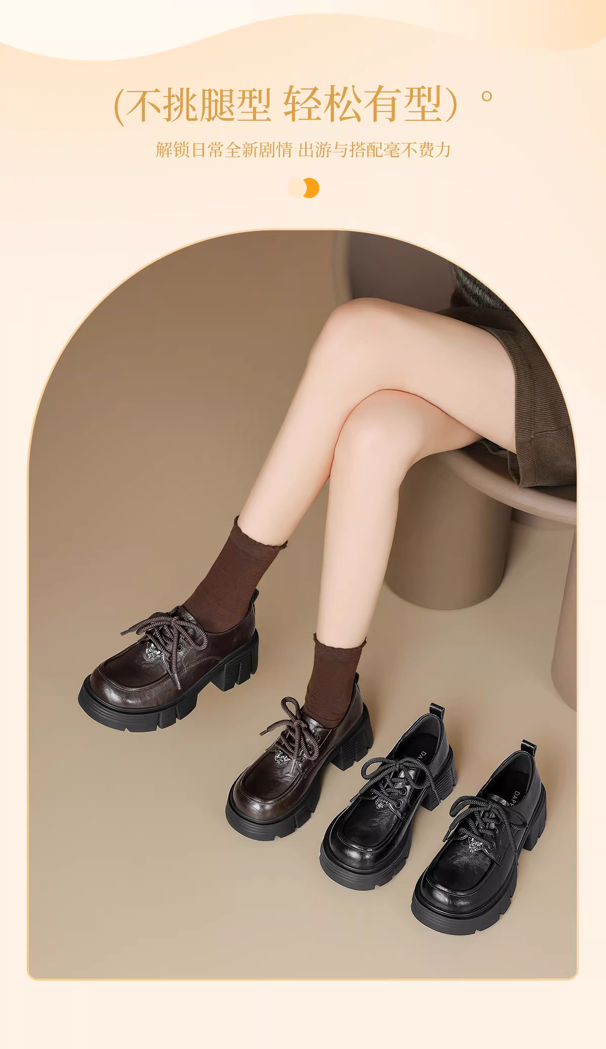 Giày lười đế dày Daphne dành cho nữ 2025, kiểu Anh, mùa thu đông mới, màu đen, dây buộc, chất liệu da, tăng chiều cao, giày đơn.
