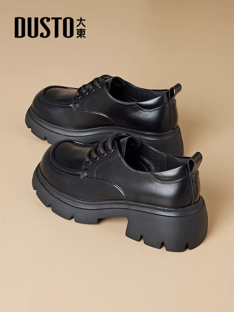 Giày lười đế xuồng chunky màu đen Dadong dành cho nữ, mẫu mới thu đông 2025, kiểu Anh, dây buộc, chất liệu da, kiểu dáng khoét sâu, giày đơn.