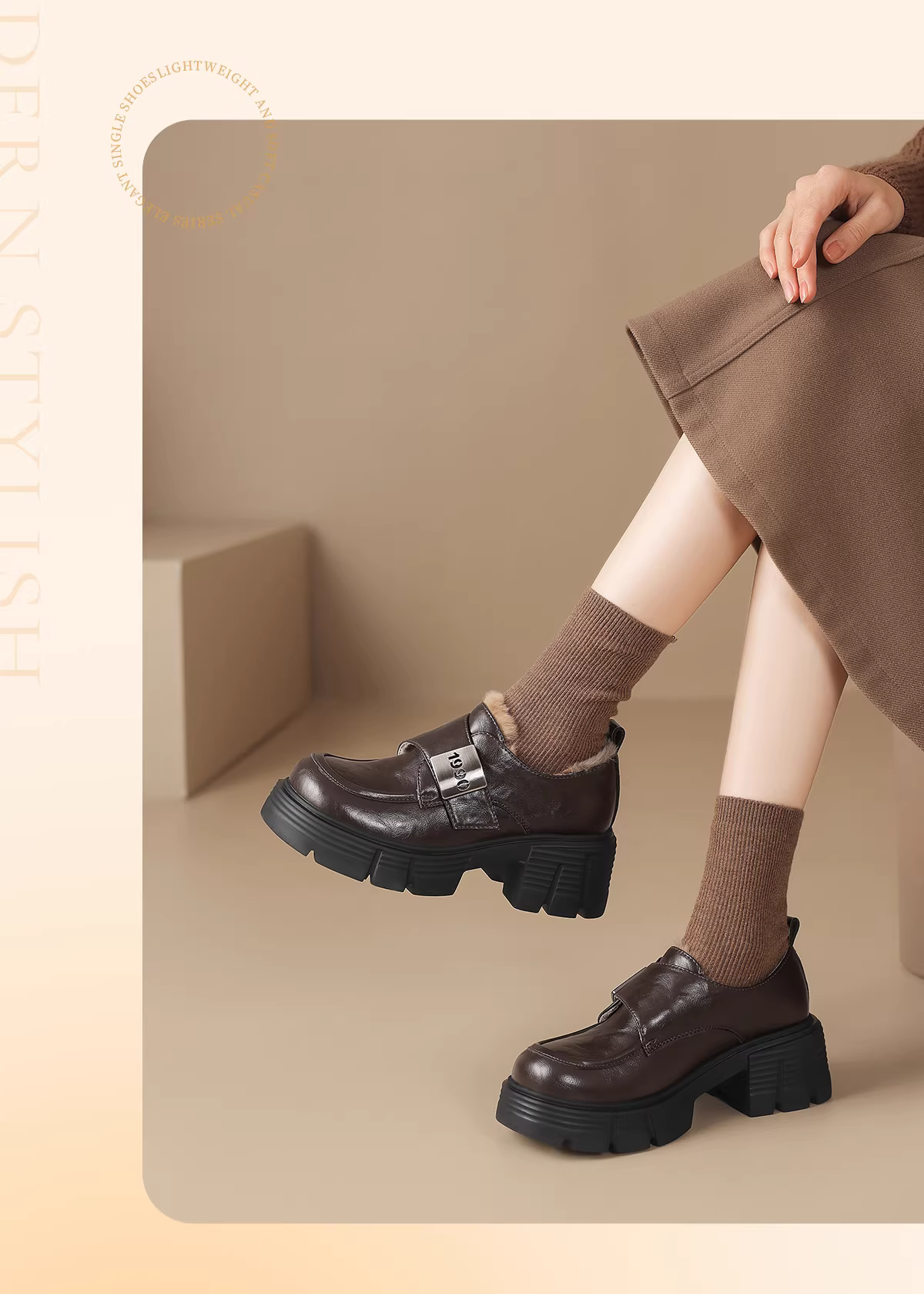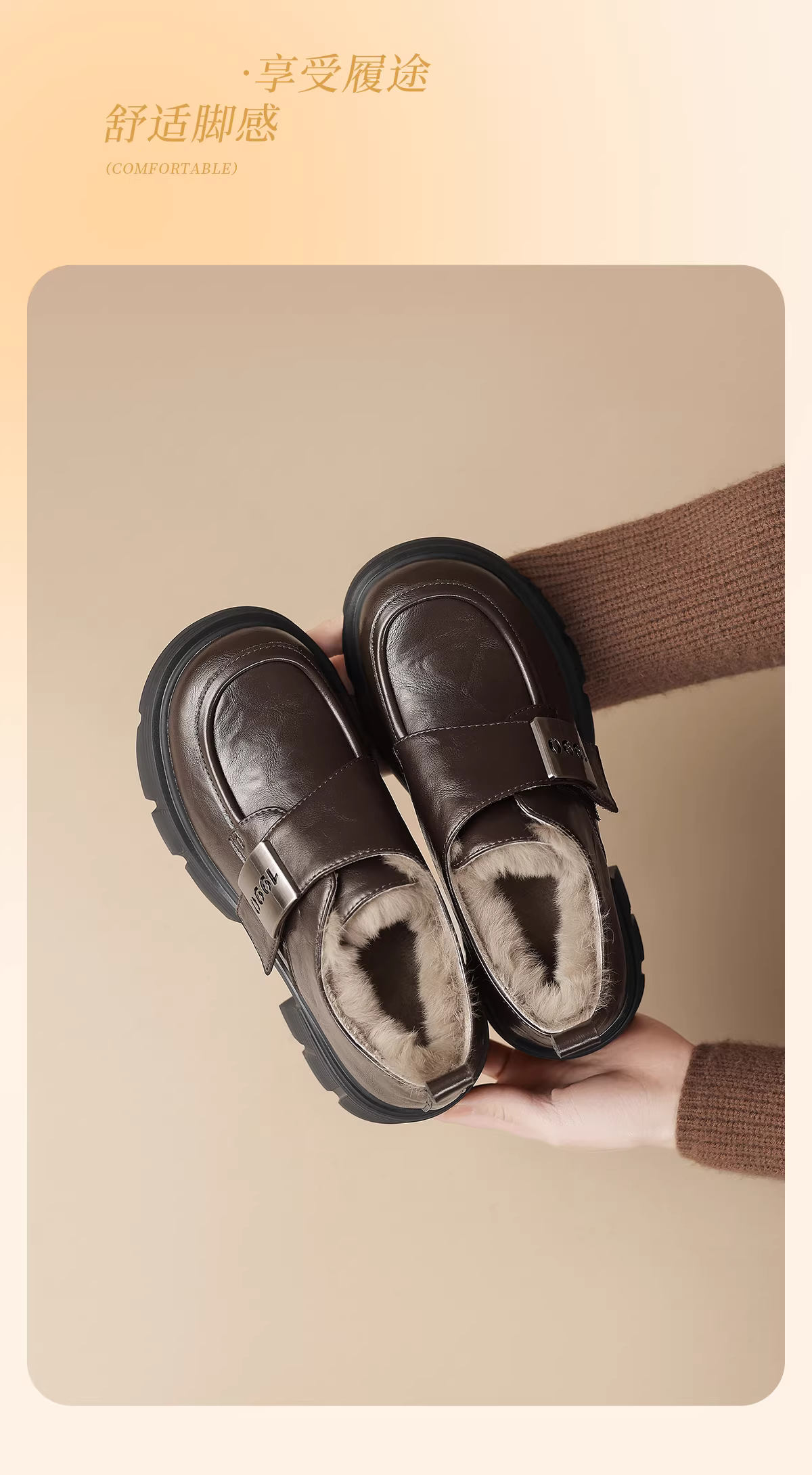 - Giày lười lót lông Daphne dành cho nữ mùa thu đông 2025, giày da đen đế dày kiểu Anh, tăng chiều cao, kiểu đơn giản