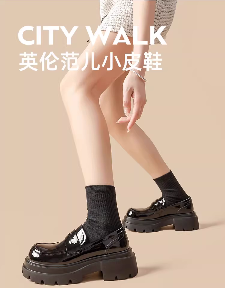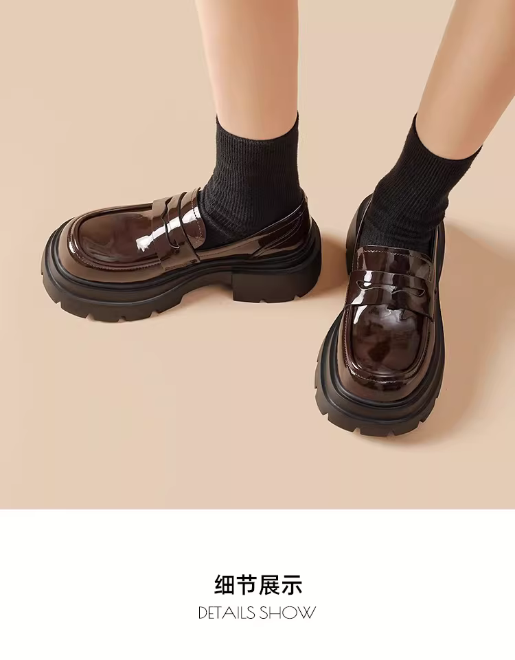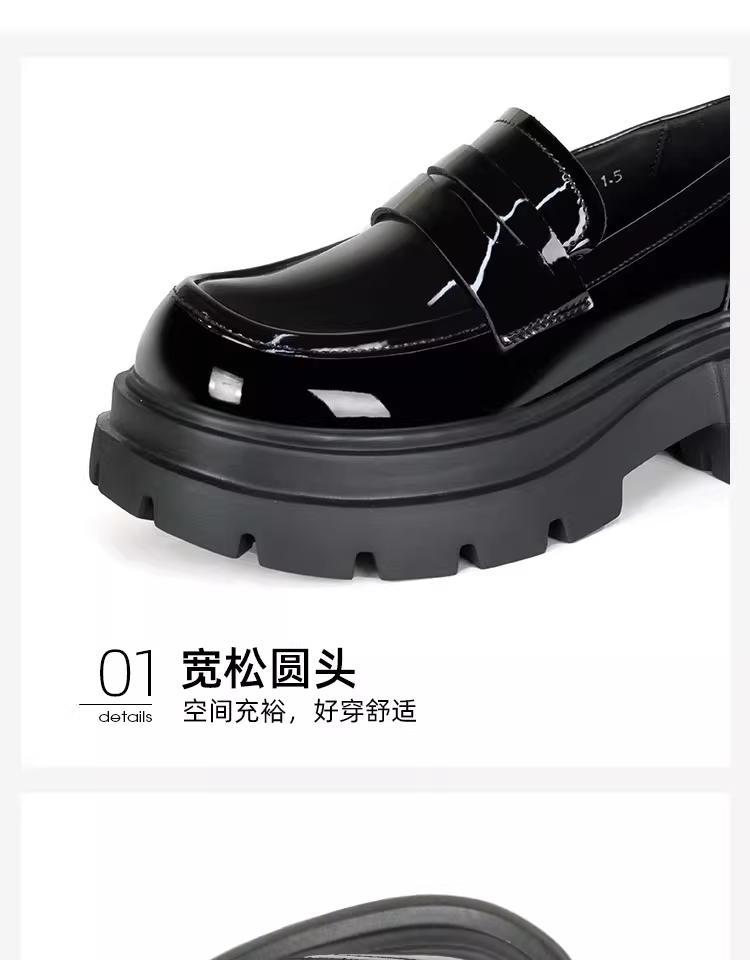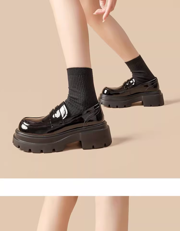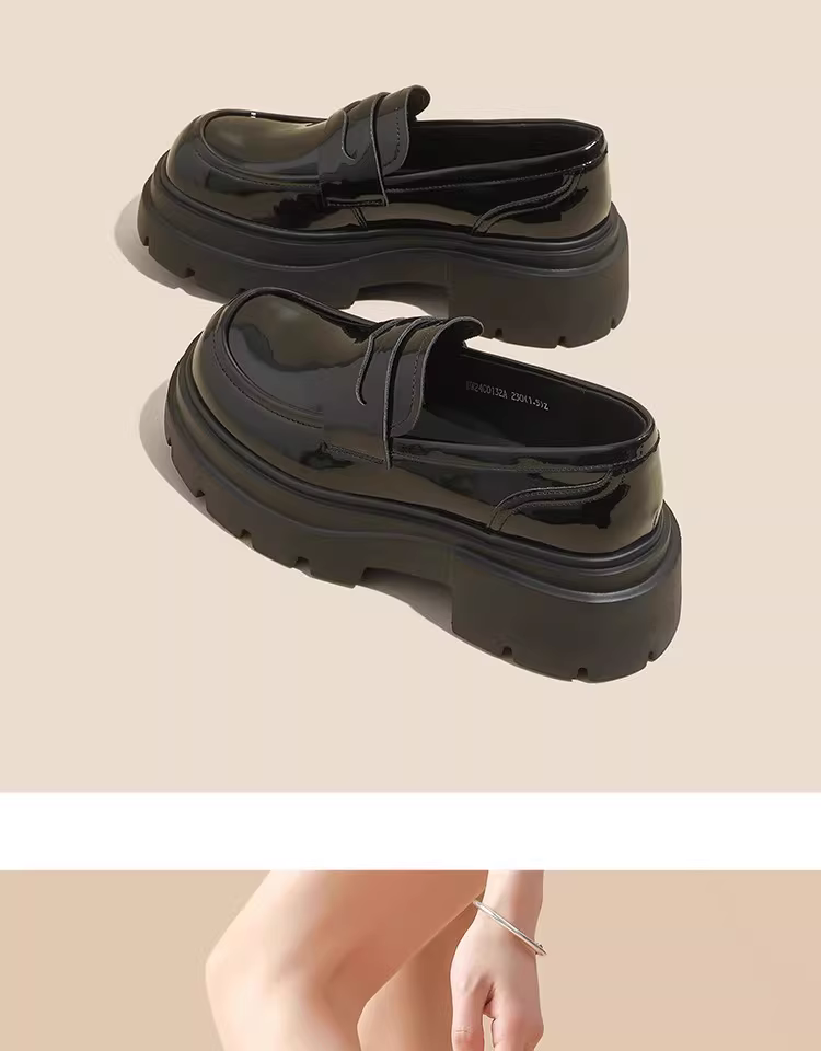 - Giày lười nữ đế dày 2025 mẫu mới thu đông màu đen da bóng mũi tròn kiểu Anh tăng chiều cao giày da nhỏ gọn