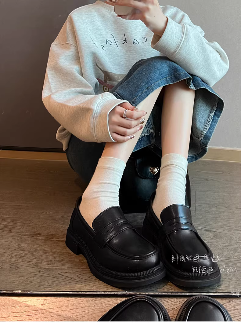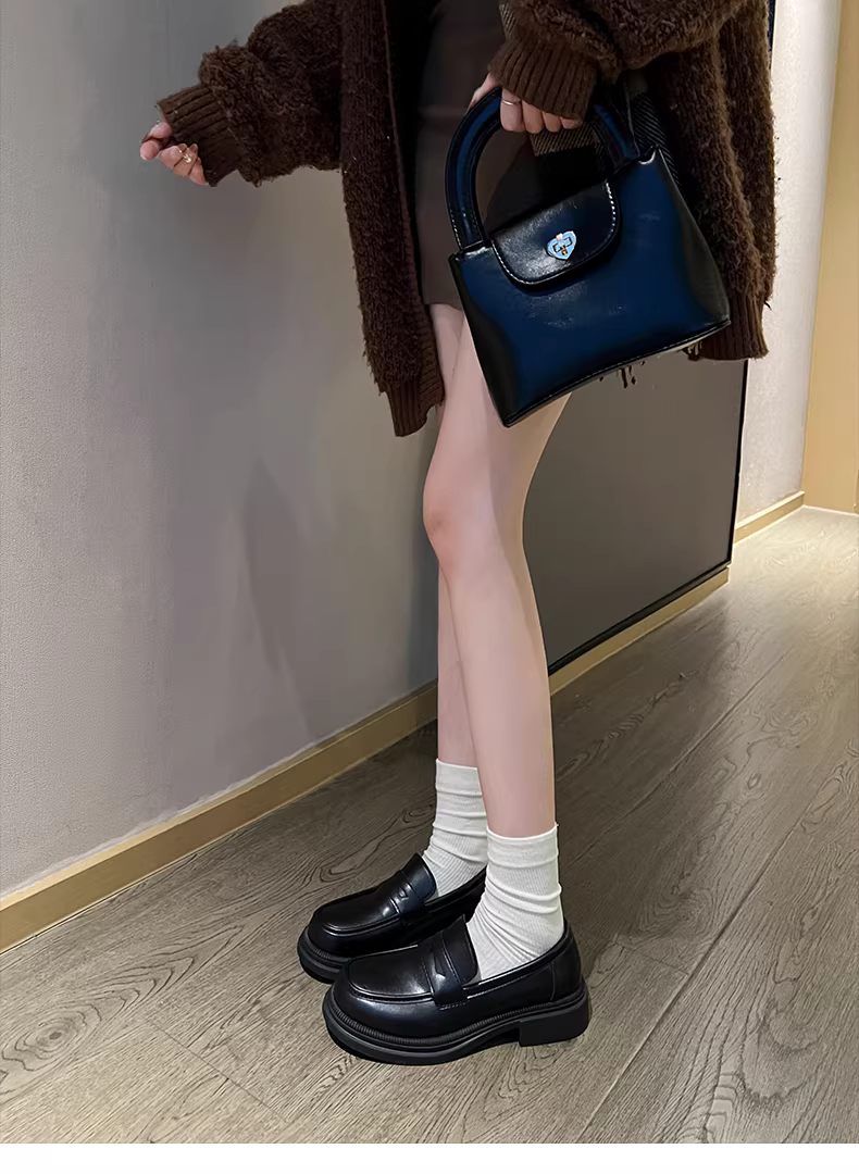 - Giày lười nữ đế dày kiểu Pháp màu đen, giày da mũi tròn cổ điển phong cách Anh mới mùa thu 2025.