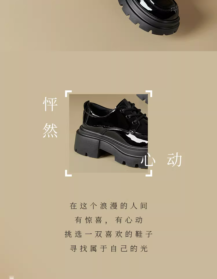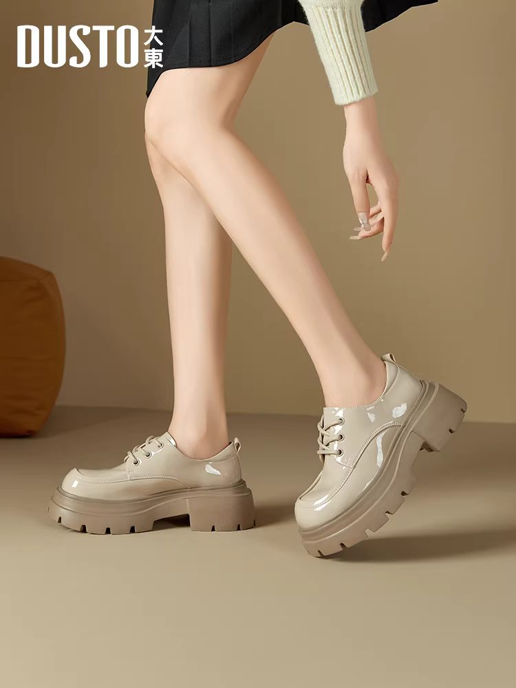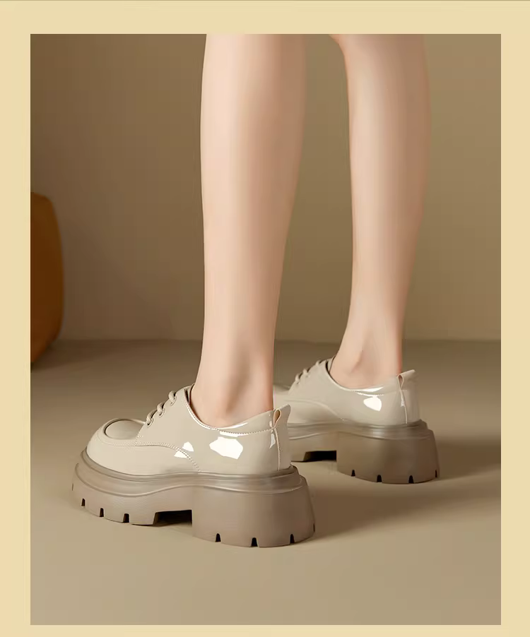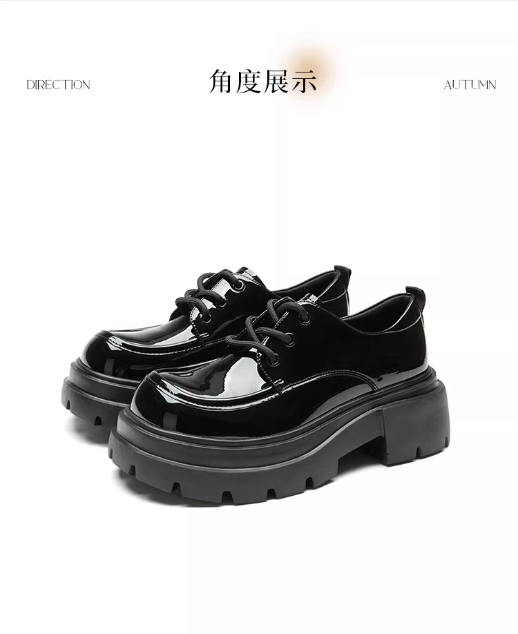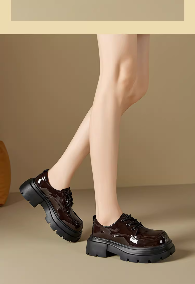 Giày lười nữ đế dày kiểu thu đông 2025, gót dày, chất liệu da bóng, kiểu dáng khoét sâu, giày Oxford buộc dây bằng da