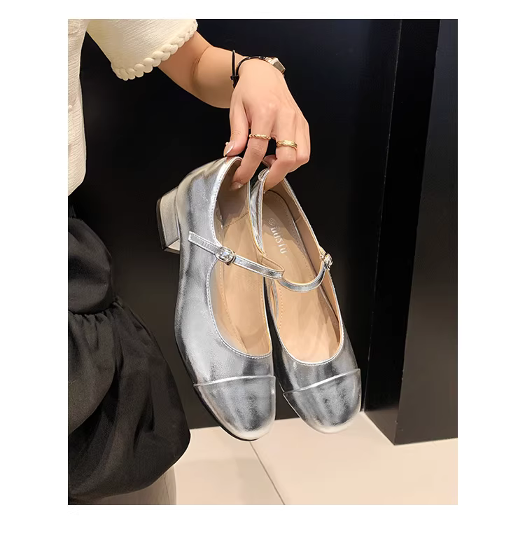 Giày Mary Jane bạc Dadong dành cho nữ 2025, kiểu mới mùa thu, gót trung bình, gót thô, quai đơn, giày nữ miệng nông, kiểu bệt