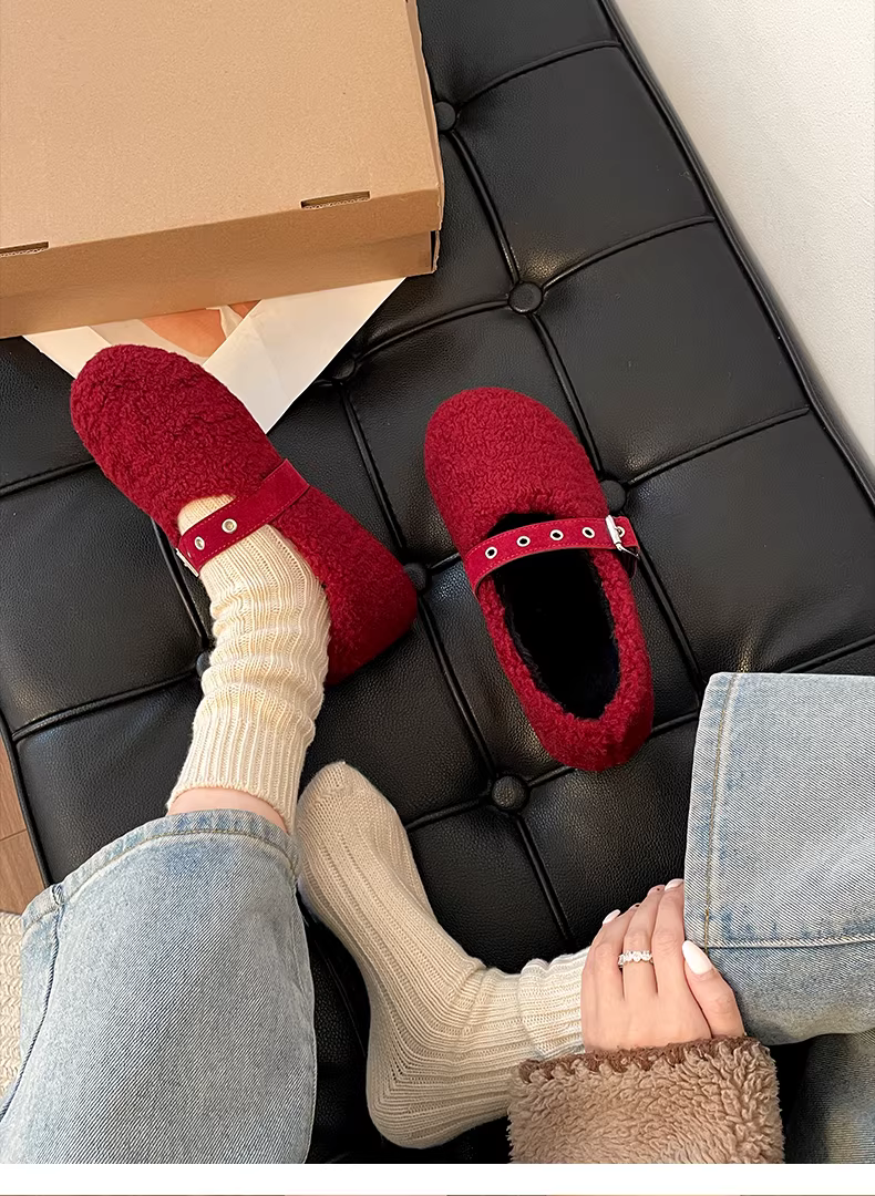 - Giày Mary Jane cổ điển lót lông cừu có độ tăng chiều cao ẩn và đế dày dành cho nữ, áo khoác ngoài mùa đông, giày cotton dày dặn ấm áp mới năm 2025.