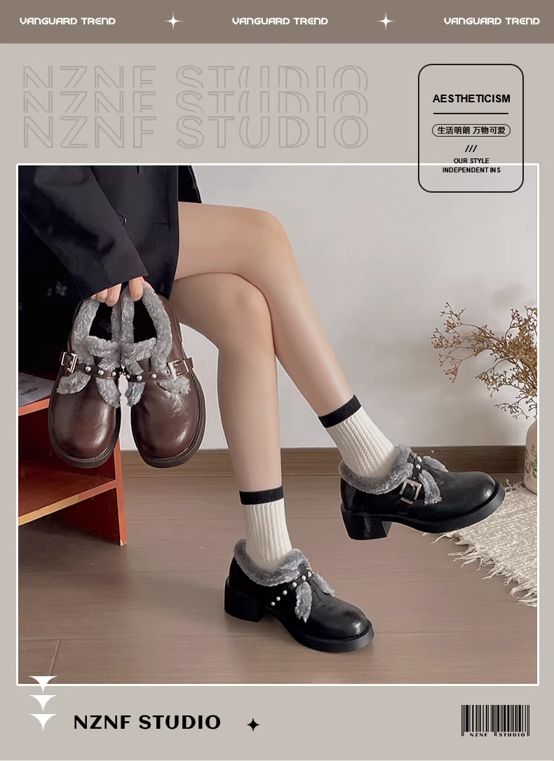 Giày Mary Jane da kiểu Anh, lót lông cừu, gót dày, dành cho nữ, mùa thu đông 2025, tăng chiều cao, dày dặn, ấm áp, chất liệu cotton