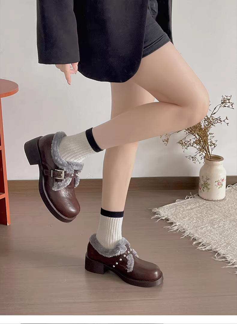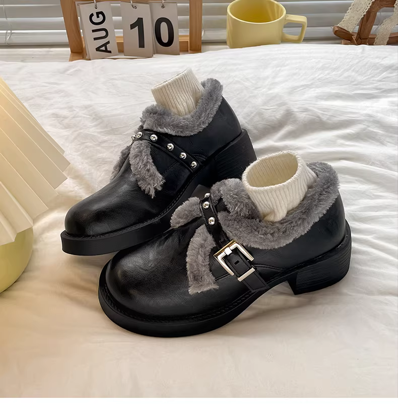 - Giày Mary Jane da kiểu Anh, lót lông cừu, gót dày, dành cho nữ, mùa thu đông 2025, tăng chiều cao, dày dặn, ấm áp, chất liệu cotton