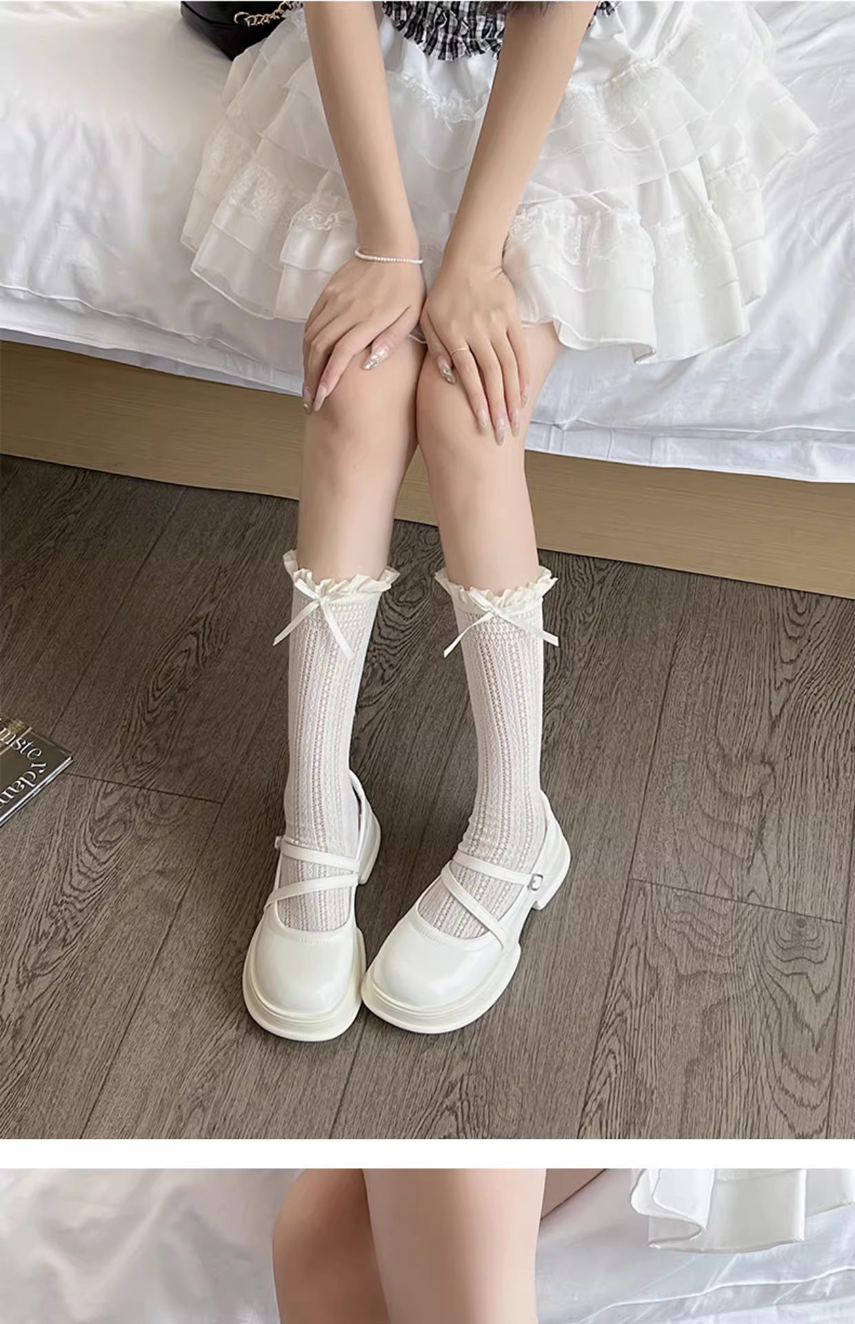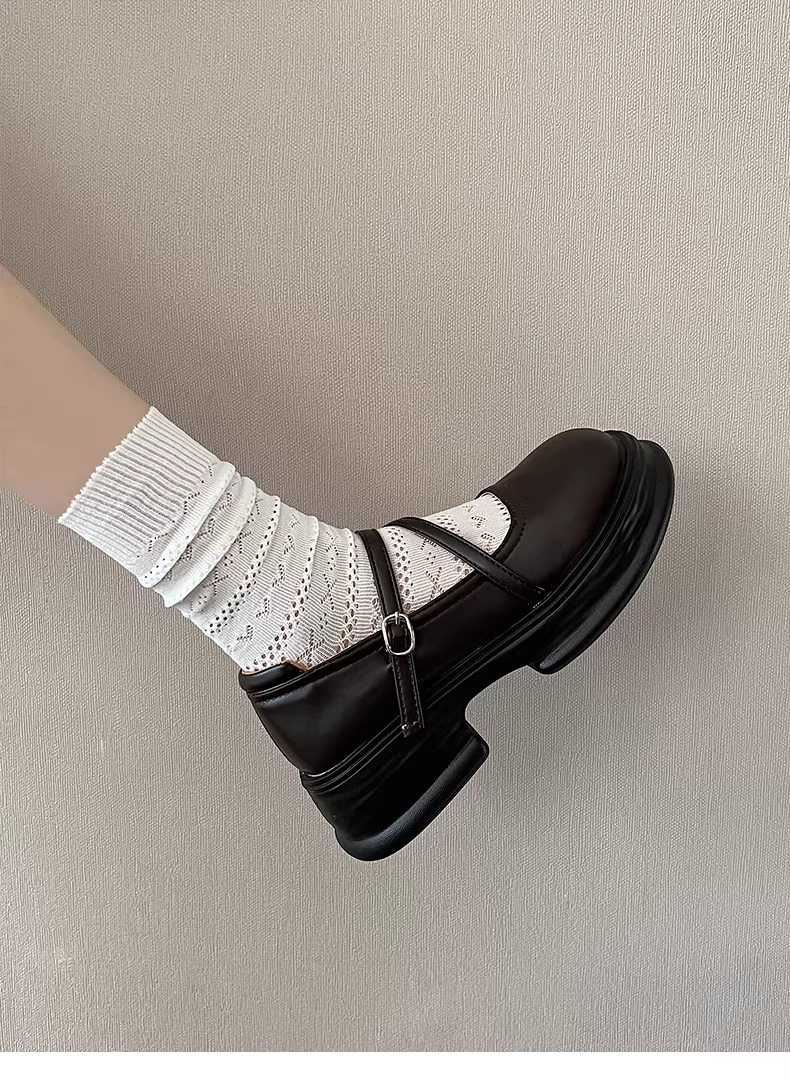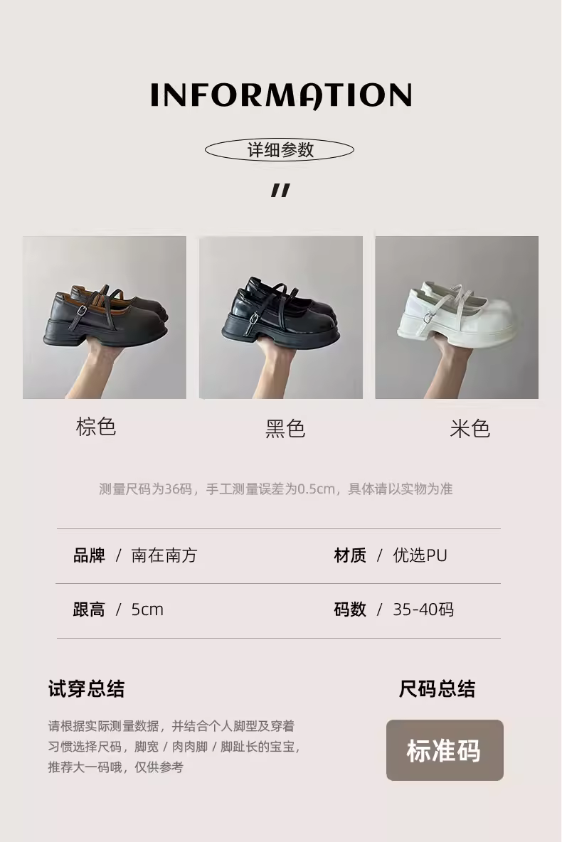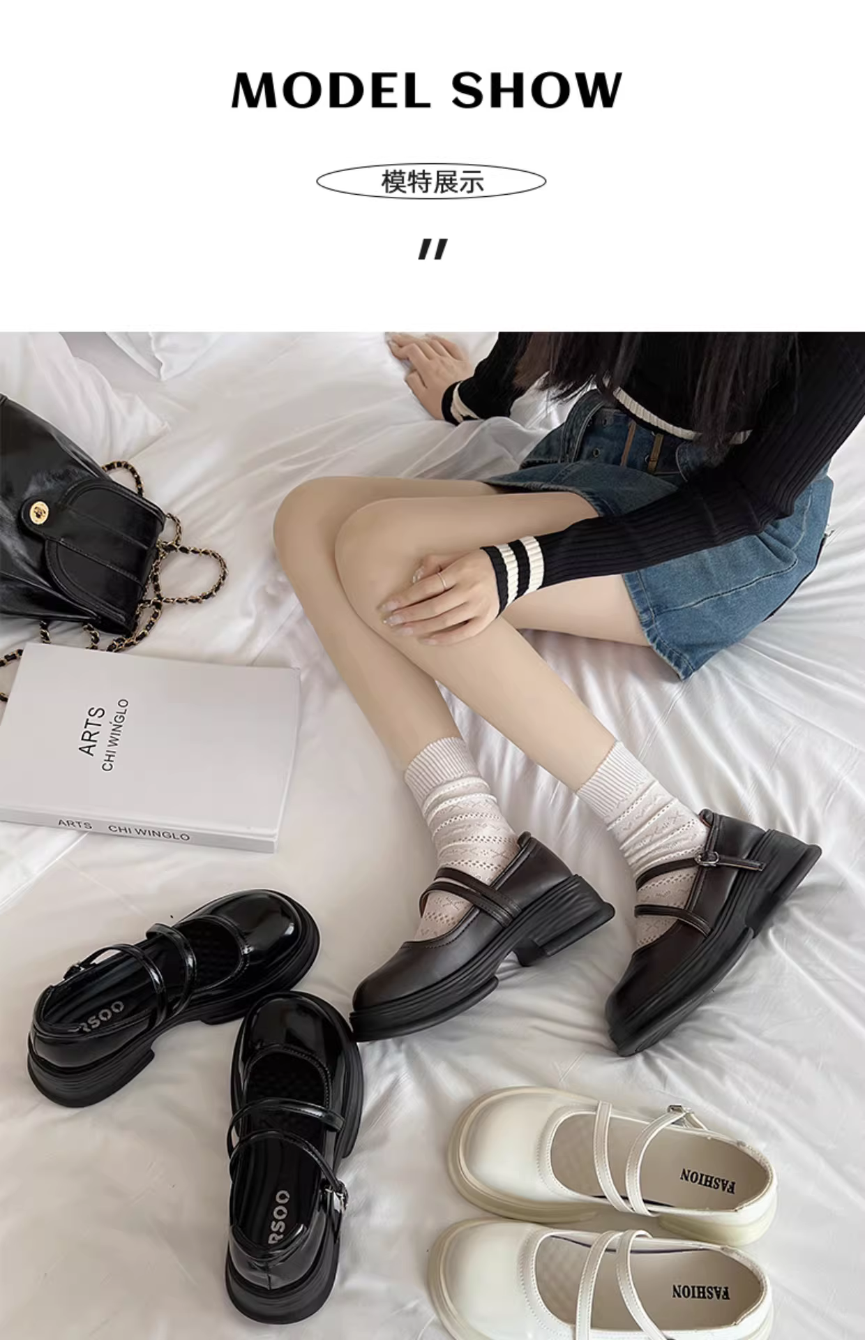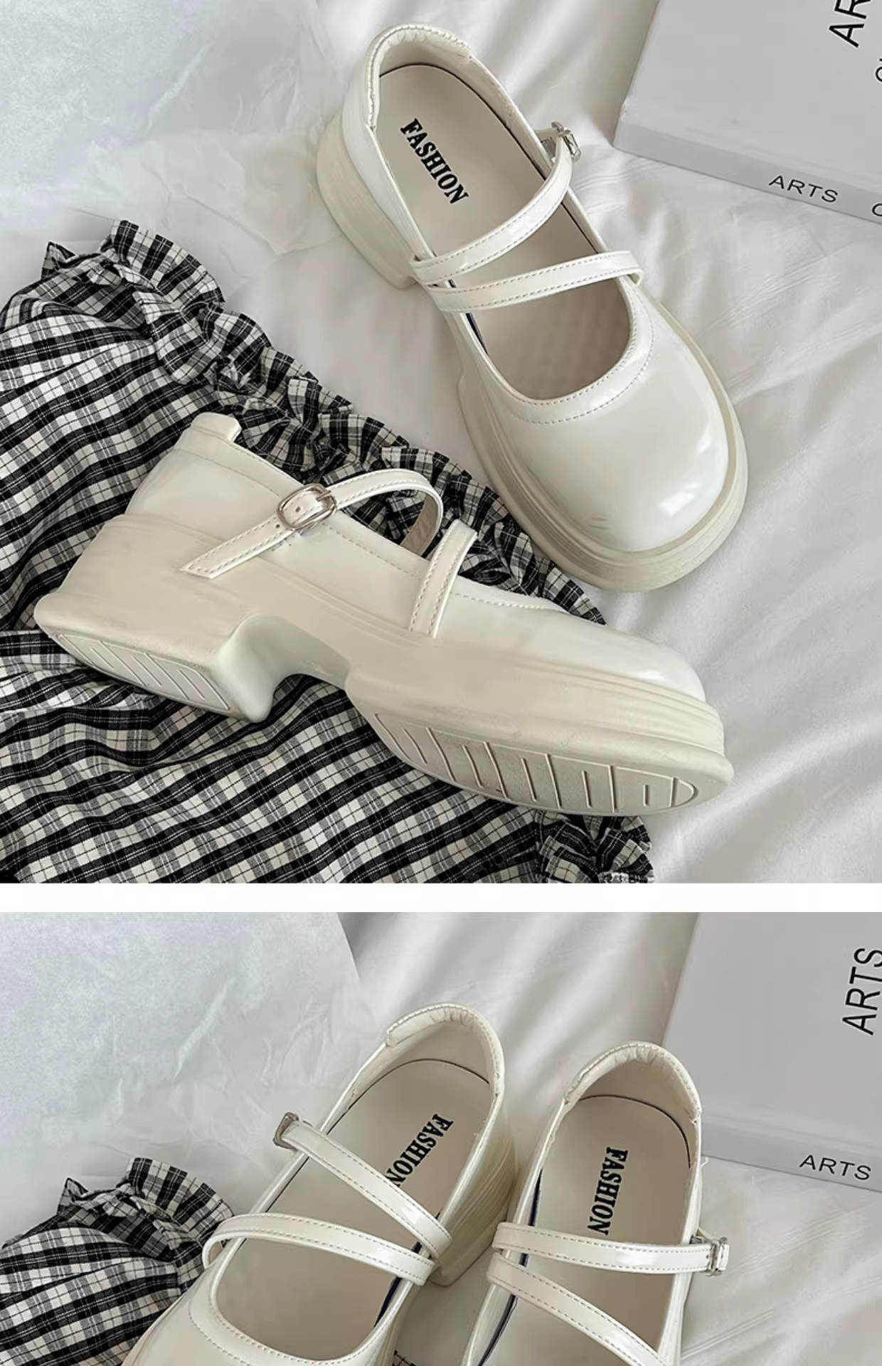 Giày Mary Jane đế xuồng chunky màu trắng dành cho nữ, kiểu Anh, mũi tròn, đế thấp, chất liệu da, mẫu mới thu 2025