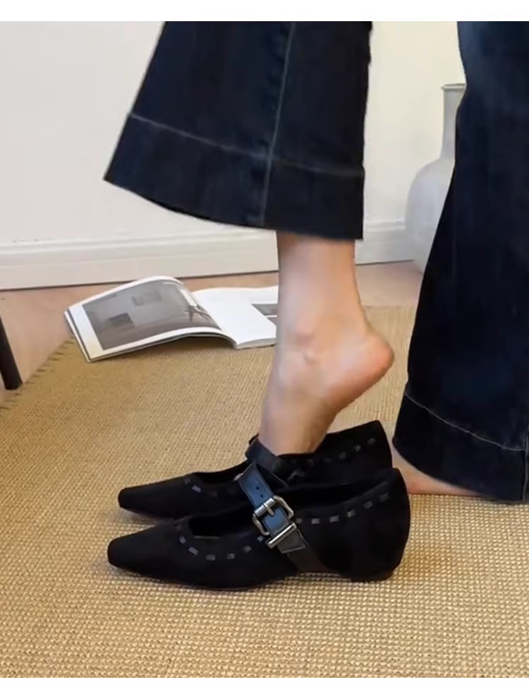 - Giày Mary Jane đế xuồng kiểu mới màu đen cổ điển, chất liệu da cừu, quai đơn, mũi vuông, kiểu dáng độc đáo dành cho nữ, chất liệu da lộn.
