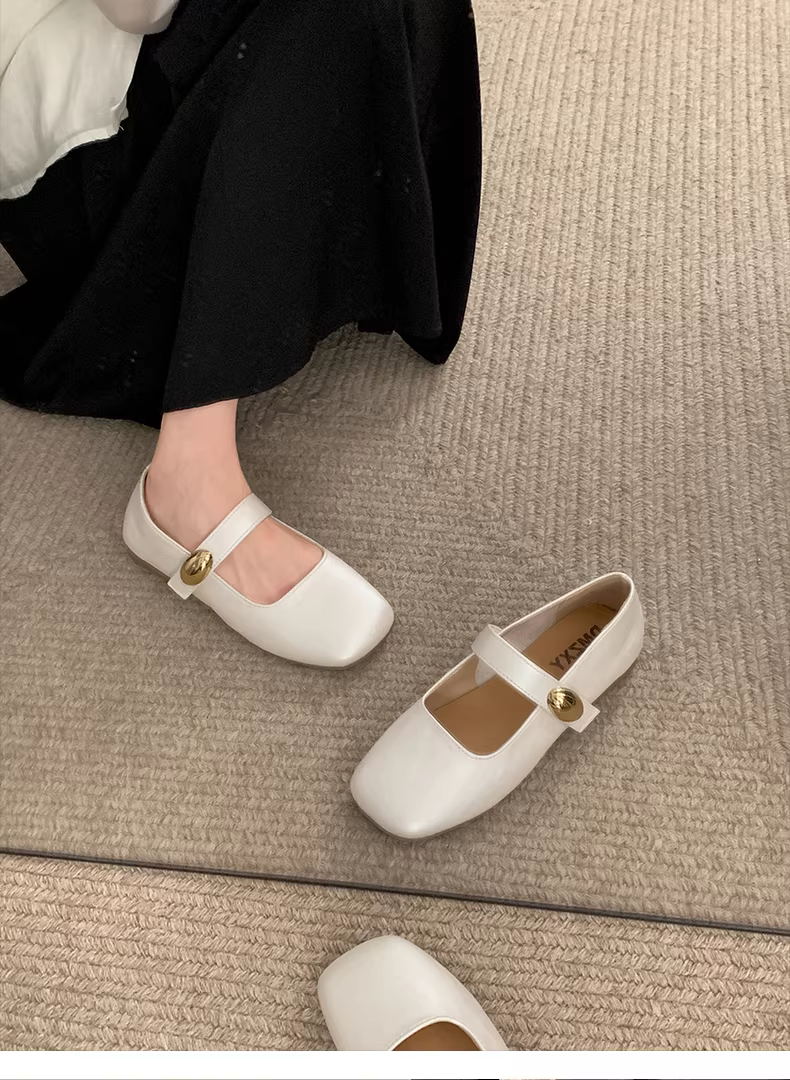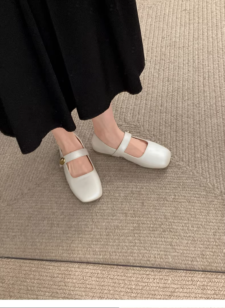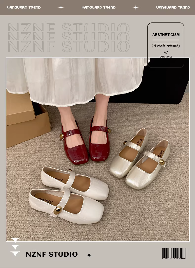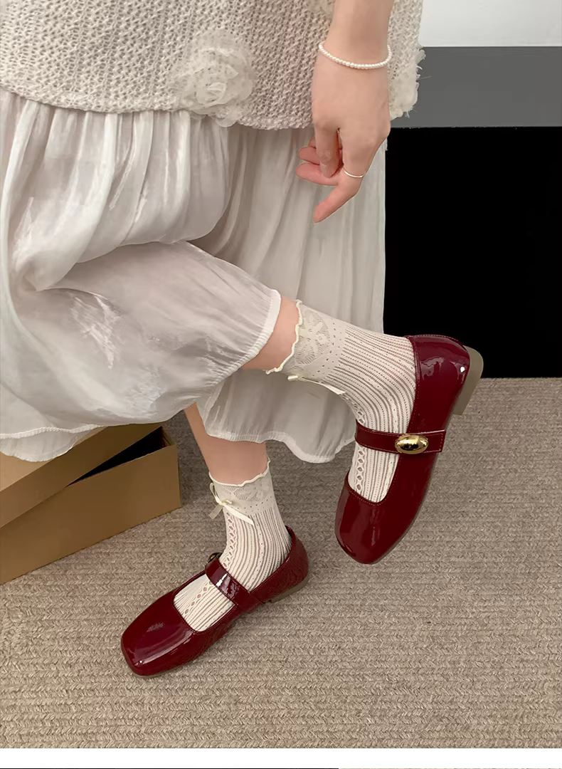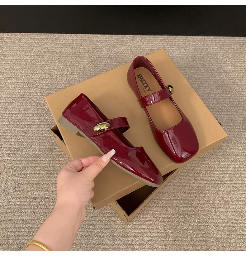 - Giày nữ kiểu Pháp màu đỏ cổ điển, mũi vuông, gót thấp, mùa thu 2025 mẫu mới, giày Mary Jane đa năng phối chân váy.