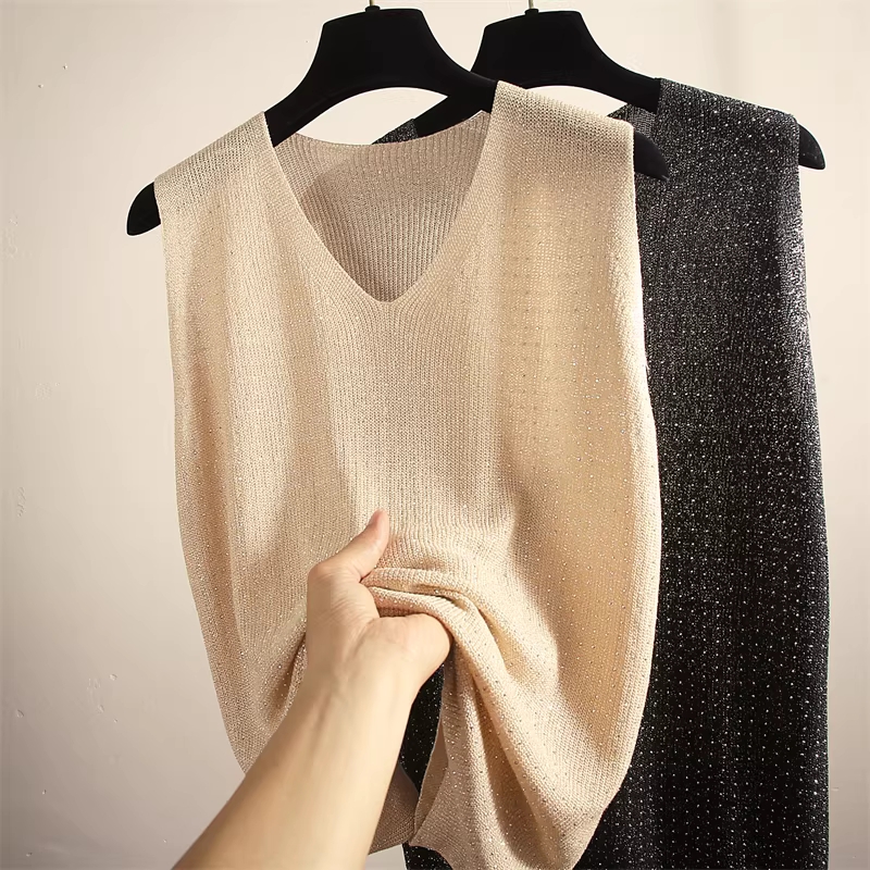 Hàng thanh lý áo vest nữ kiểu Âu, có mác, chất liệu lụa bóng, đính đá, cổ V, dáng rộng, màu trơn, không tay.