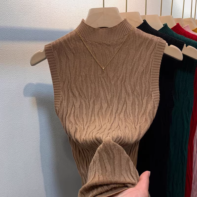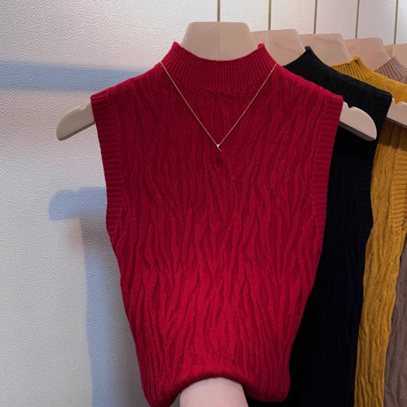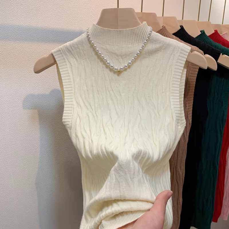 Hàng thanh lý quần áo nữ châu Âu, có mác cắt, áo kiểu dáng độc đáo cổ nửa cao không tay, áo len dệt kim thanh lịch.