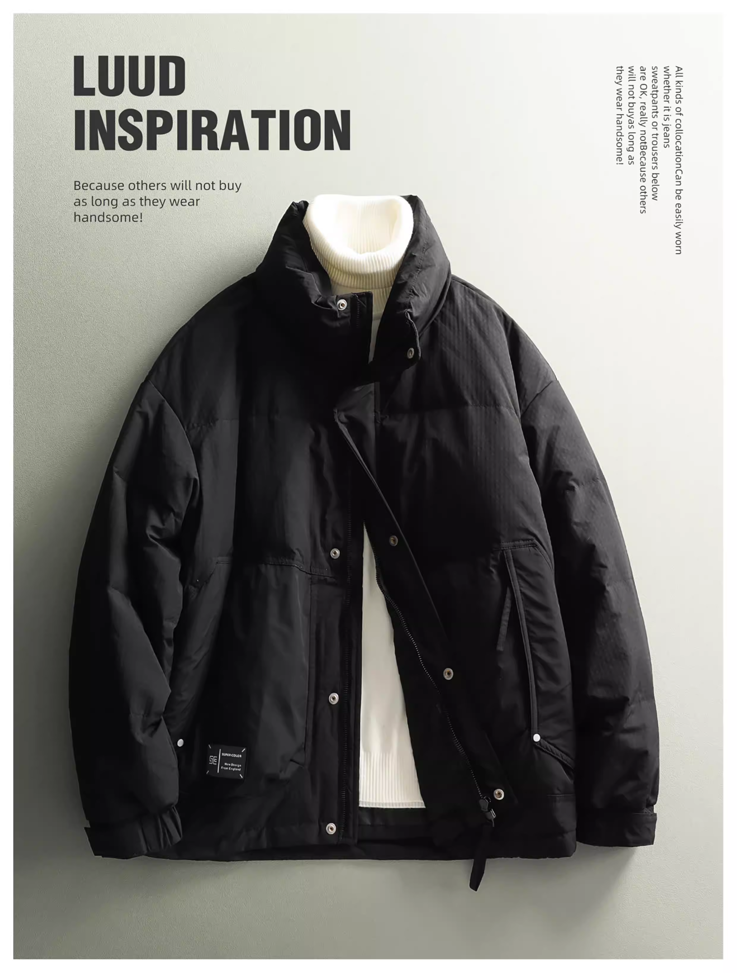 Khuyến mãi đặc biệt: Áo khoác phao nam dày dặn không mũ, kiểu mới mùa đông 2025, chống lạnh và ấm áp, cổ đứng, thời trang.