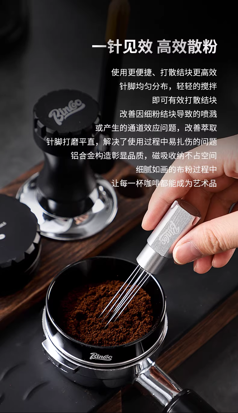 - Kim phân phối cà phê từ tính Bincoo để khuấy và phá vỡ các cục, phân phối đều bã cà phê, dụng cụ phân phối cà phê kiểu Ý để khuấy.