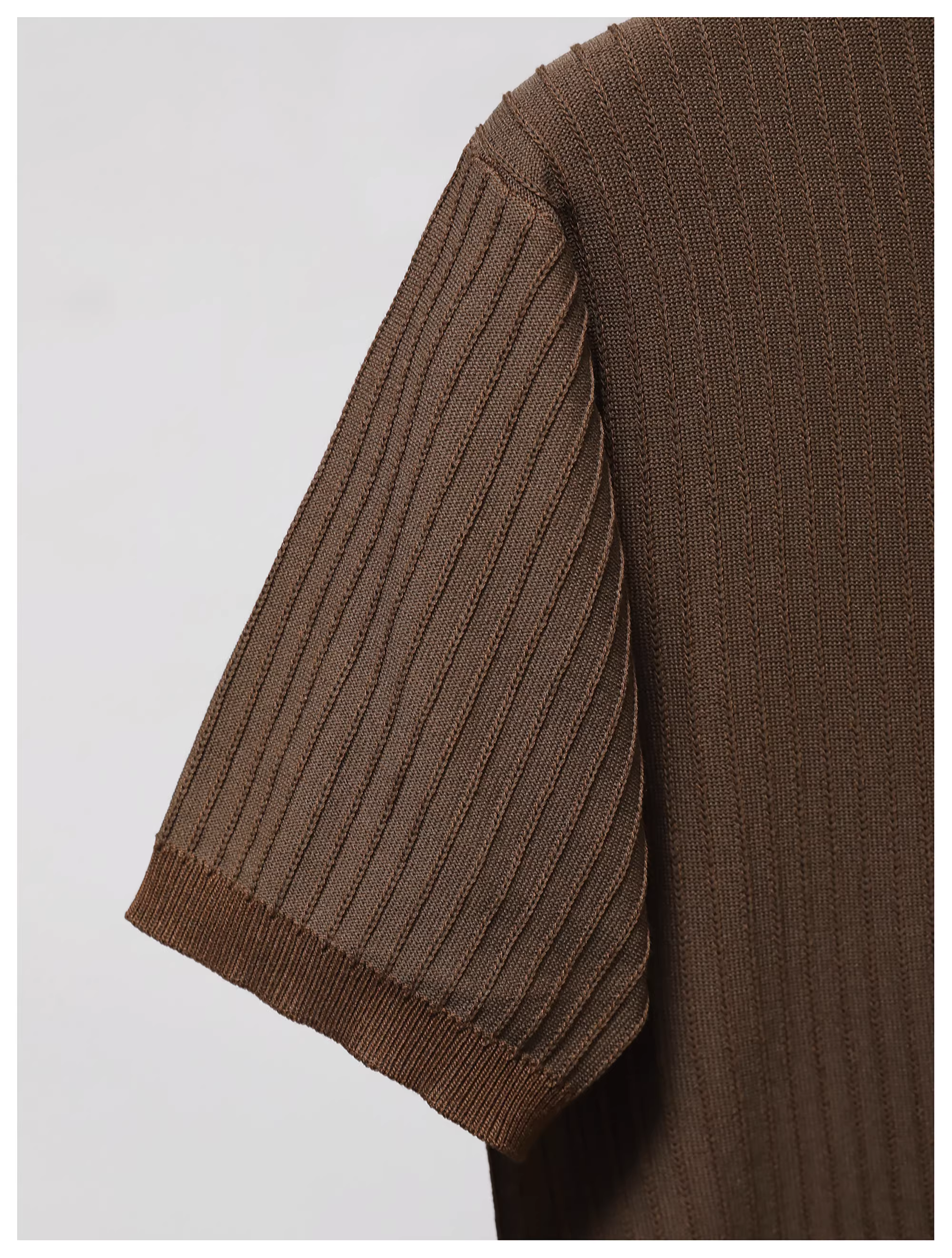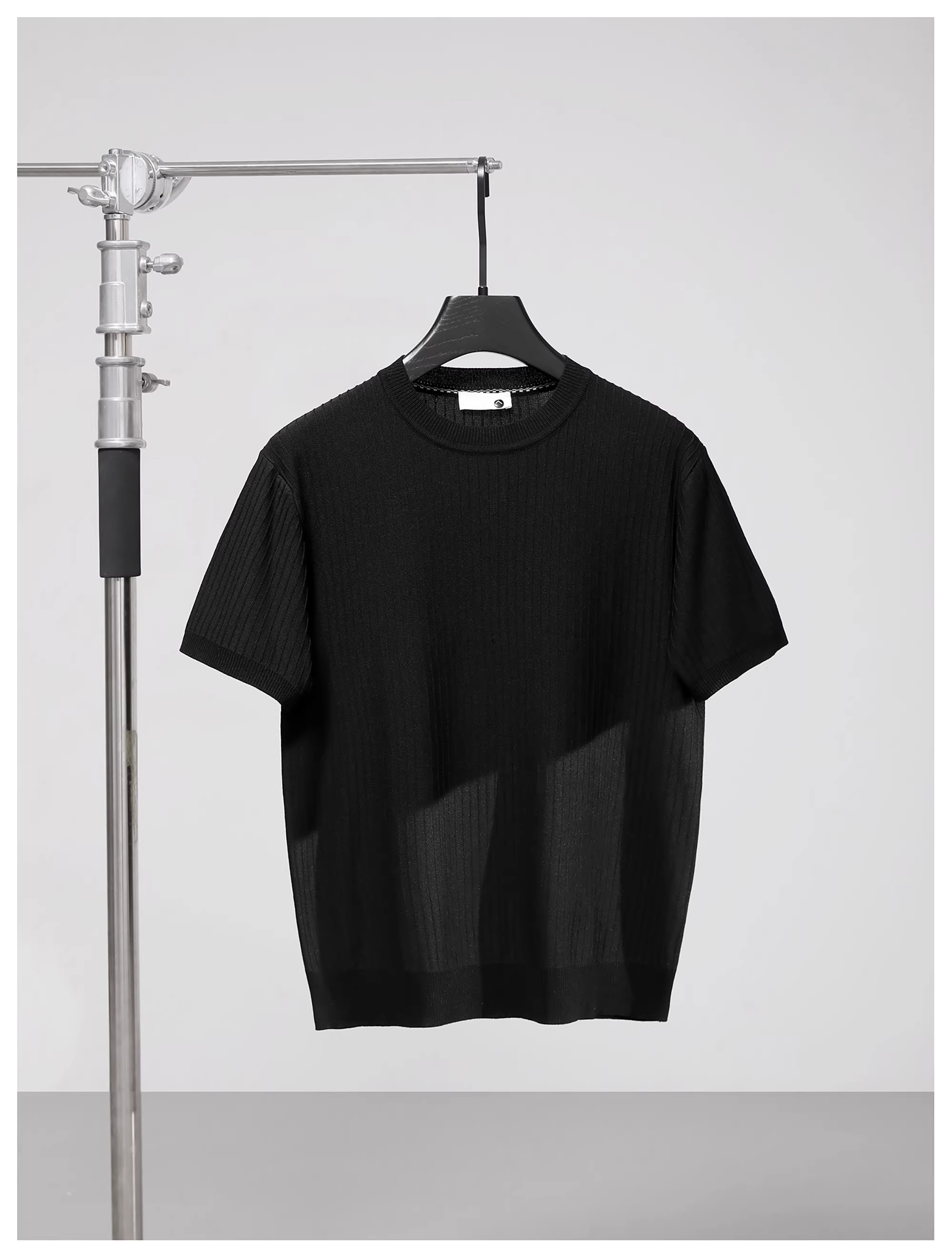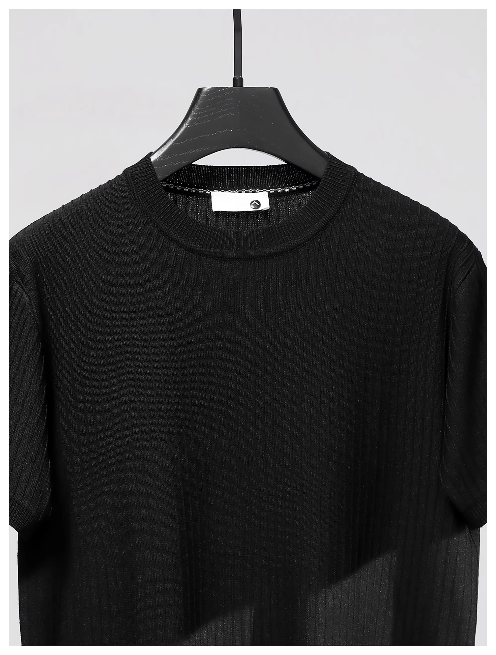 - LUUD chất liệu lụa mát mẻ dệt hoa sọc nổi nam dệt kim cổ tròn tay ngắn áo thun mỏng thời trang