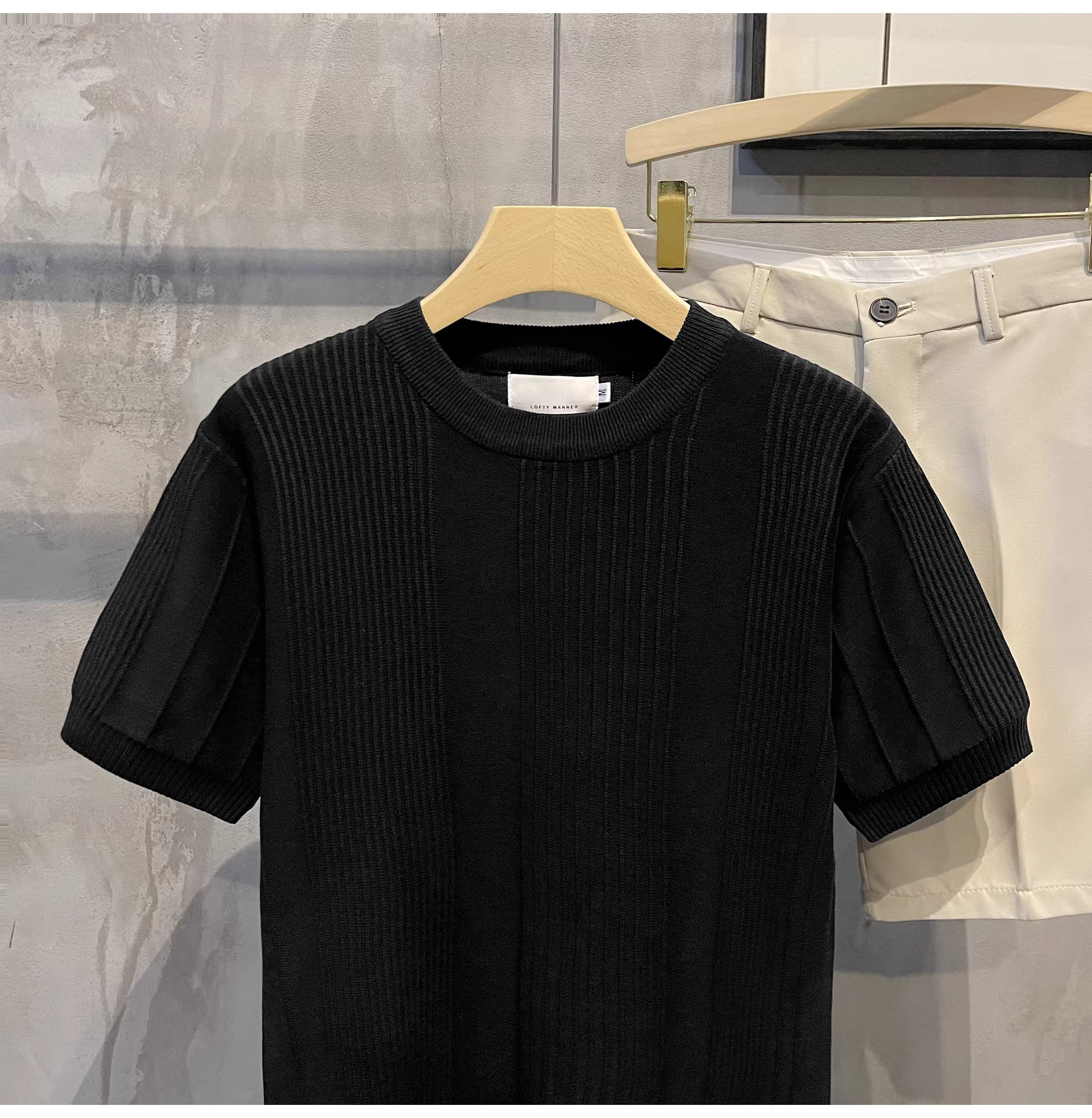 - LUUD giả vải lanh mát mẻ lụa cổ tròn dệt kim Áo thun đơn giản màu trơn sọc dọc giản dị nam dáng ôm vừa vặn hàng đầu