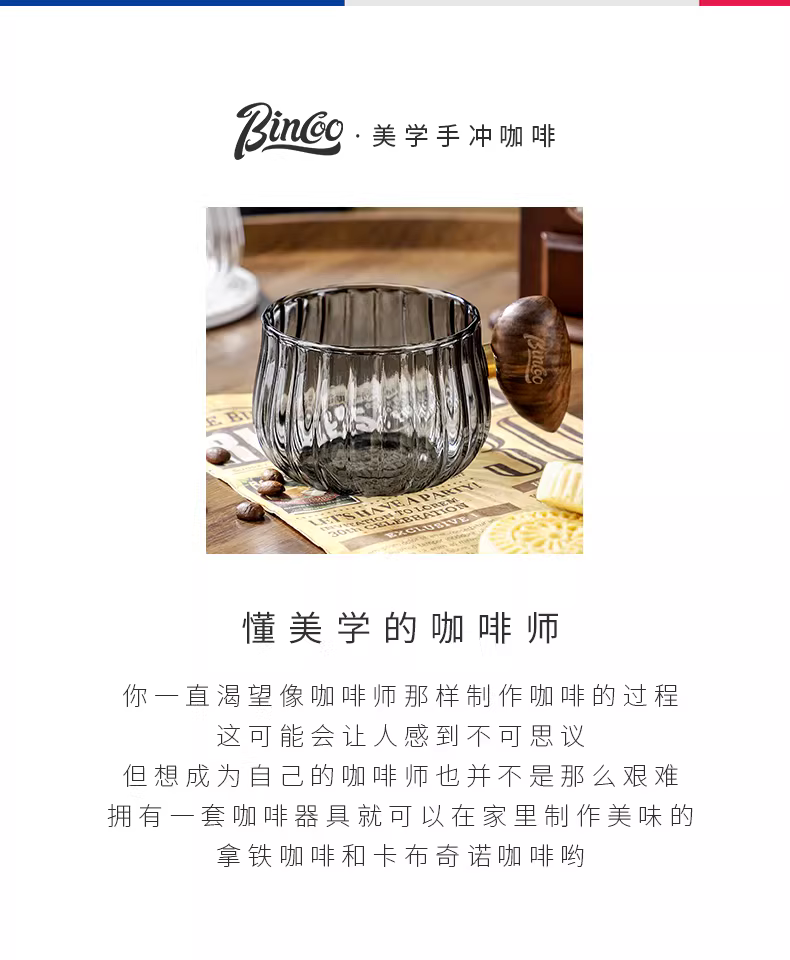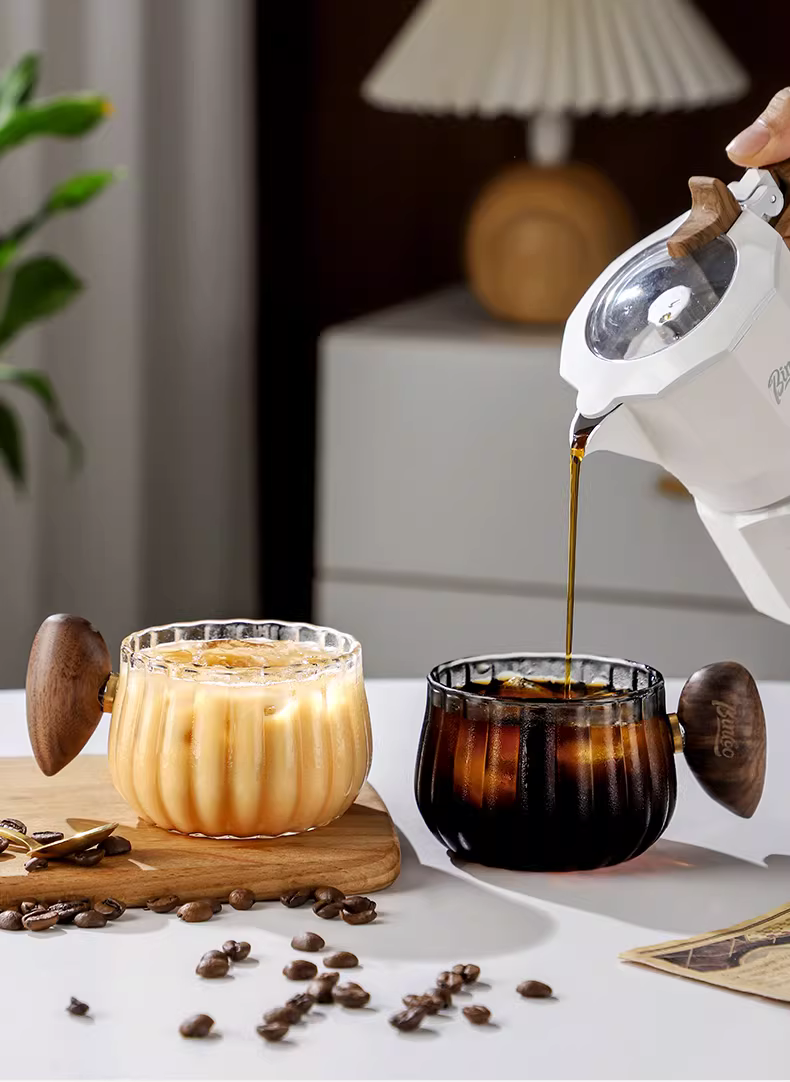 Ly cà phê thủy tinh Bincoo, ly latte cao cấp, ly Americano đá, tay cầm gỗ sọc dọc, cốc cổ điển