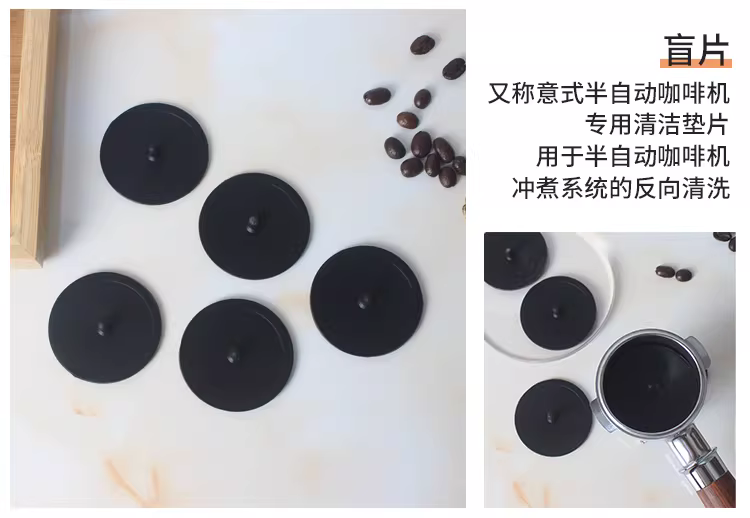 1. 先将盲片放入咖啡机单份手柄滤网内尖头向上,再放一小勺咖啡机专用清洗药粉或两粒粒咖啡垢专用清洁药片,按冲煮键,运行约10 秒,然后关闭。