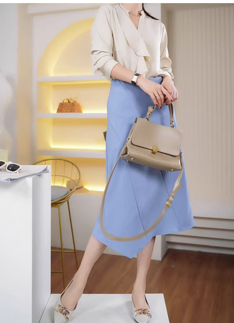 - Một chiếc váy midi chữ A cạp cao bất đối xứng màu xanh dành cho đầu mùa xuân.