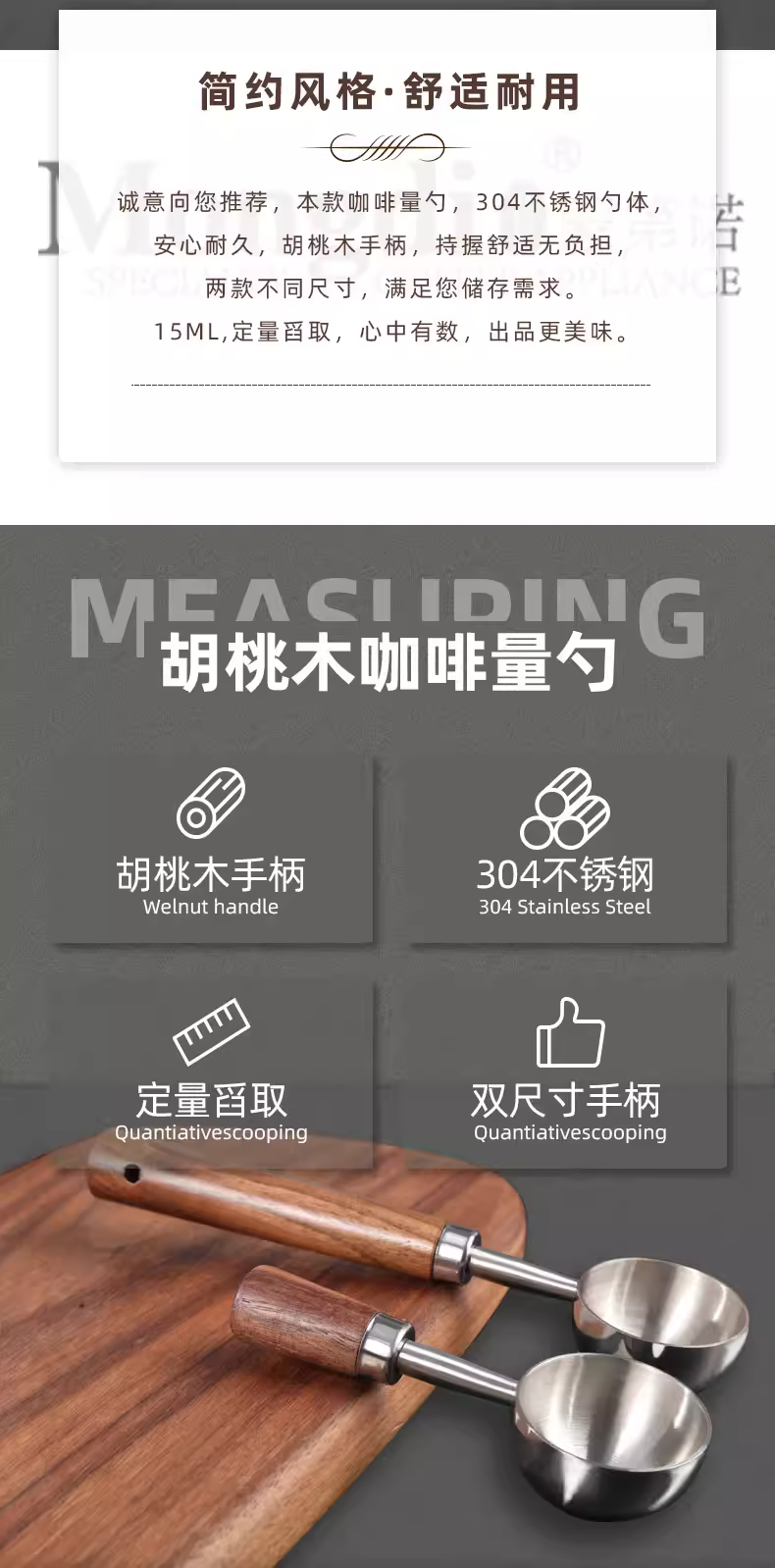 Muỗng cà phê bằng thép không gỉ Mongdio muỗng đo lường muỗng bột tay cầm quả óc chó muỗng gram tay cầm bằng gỗ hạt cà phê muỗng đặc biệt