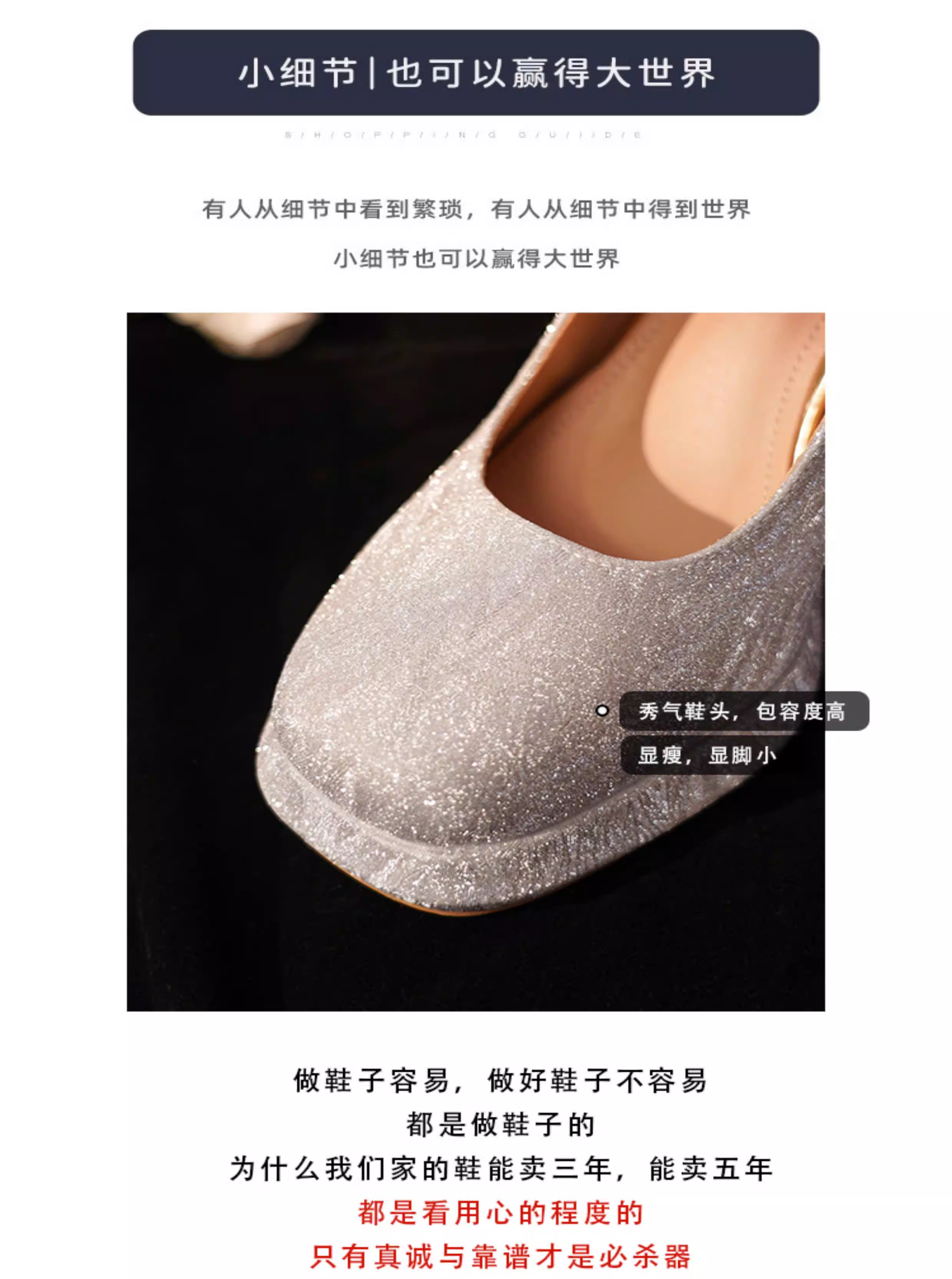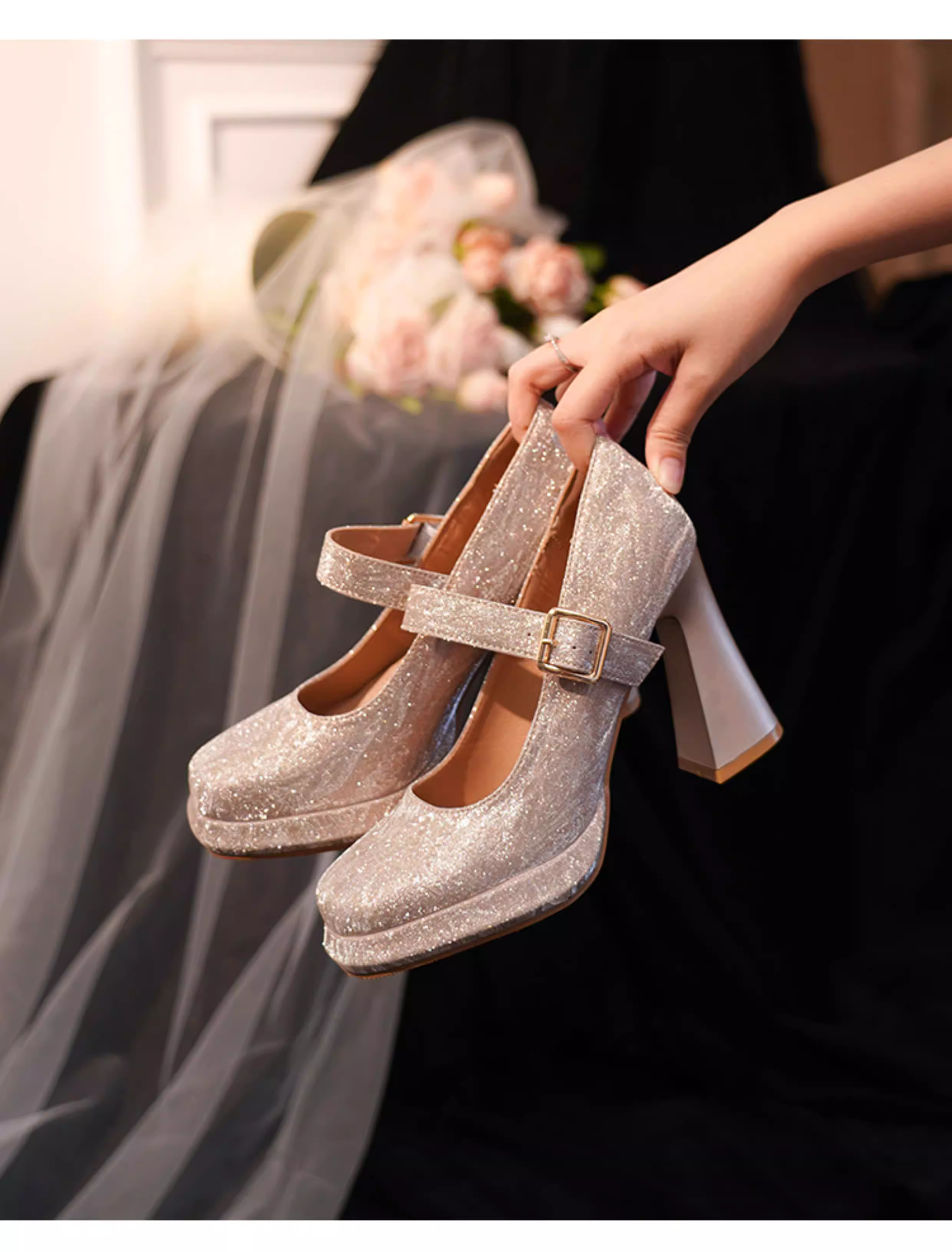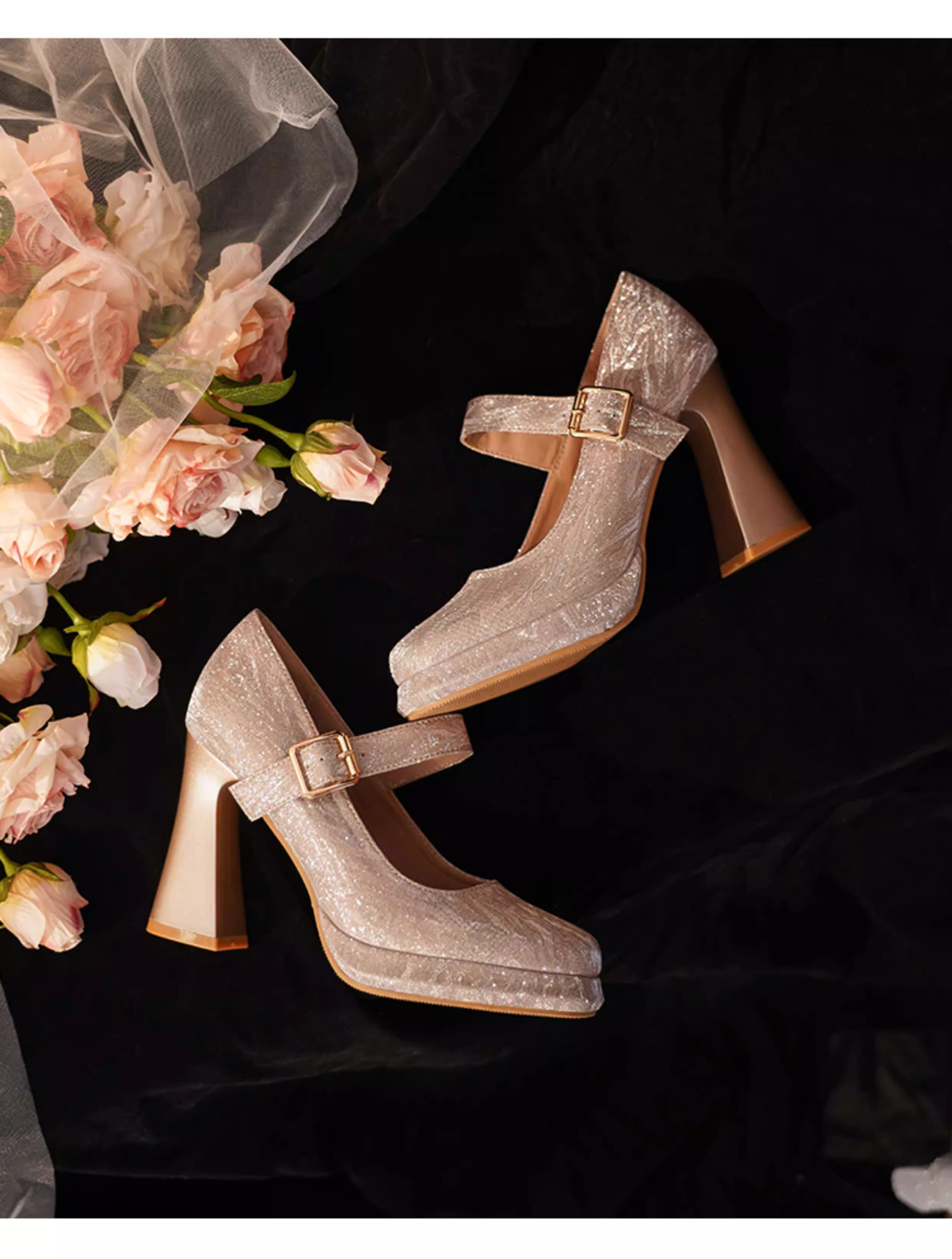 Pear Little Seven~ Giày cưới kiểu Pháp màu sâm panh dành cho nữ, giày phù dâu, giày cao gót Mary Jane có quai đơn, giày đế bệt gót thô.