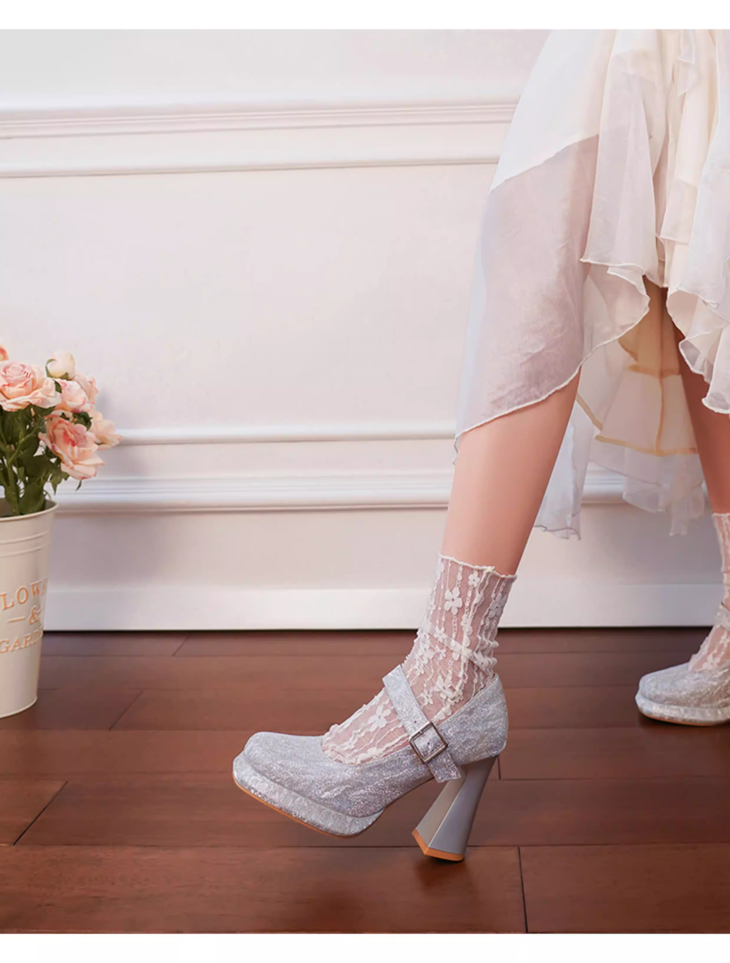 - Pear Little Seven~ Giày cưới kiểu Pháp màu sâm panh dành cho nữ, giày phù dâu, giày cao gót Mary Jane có quai đơn, giày đế bệt gót thô.