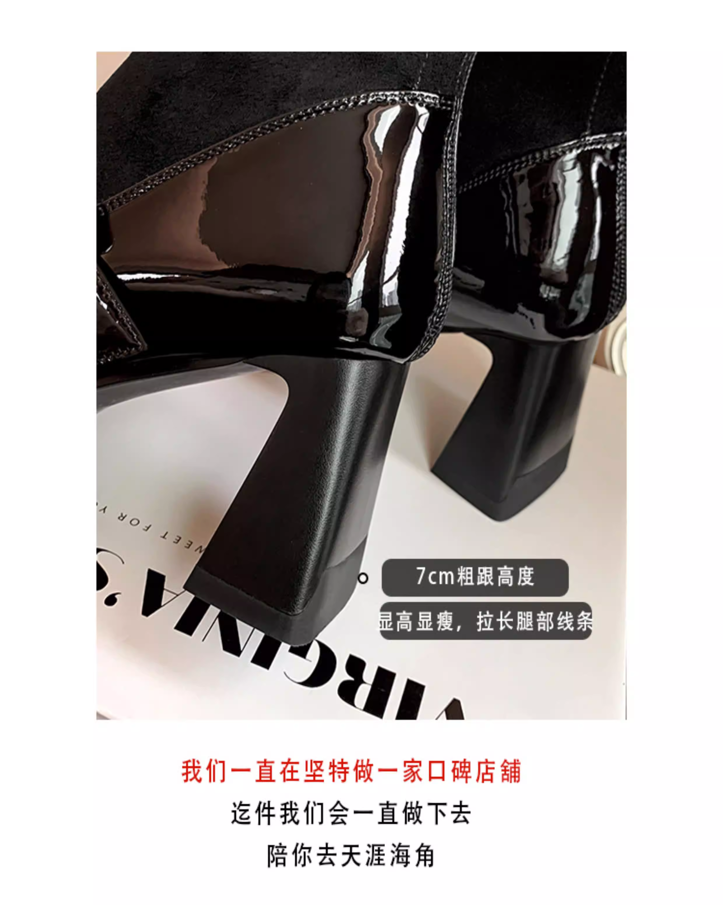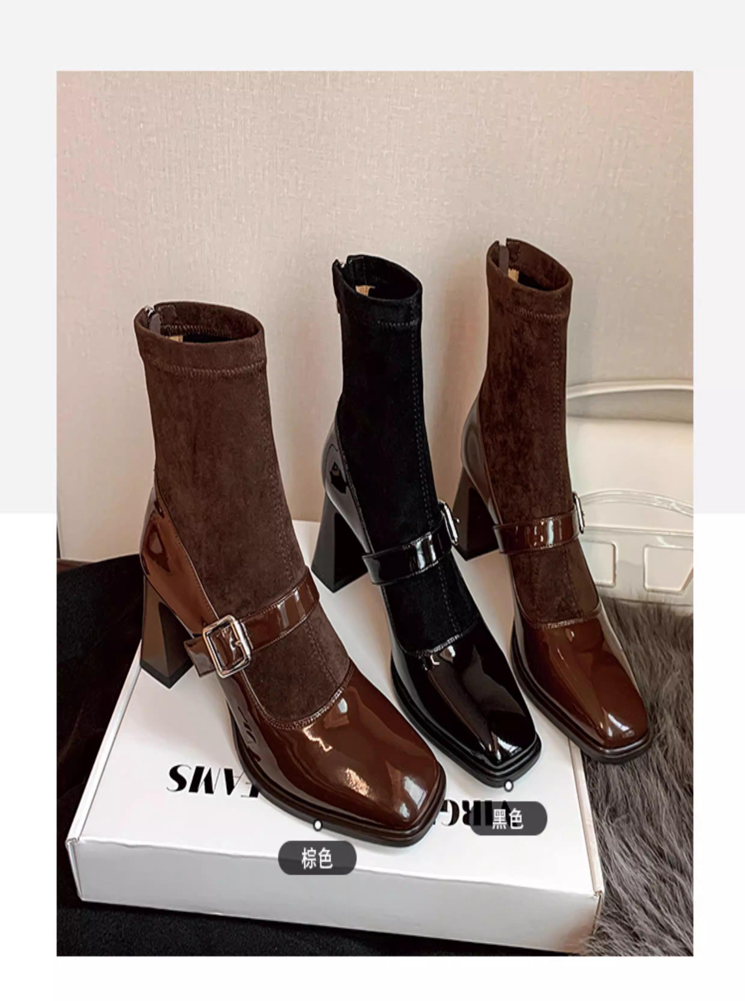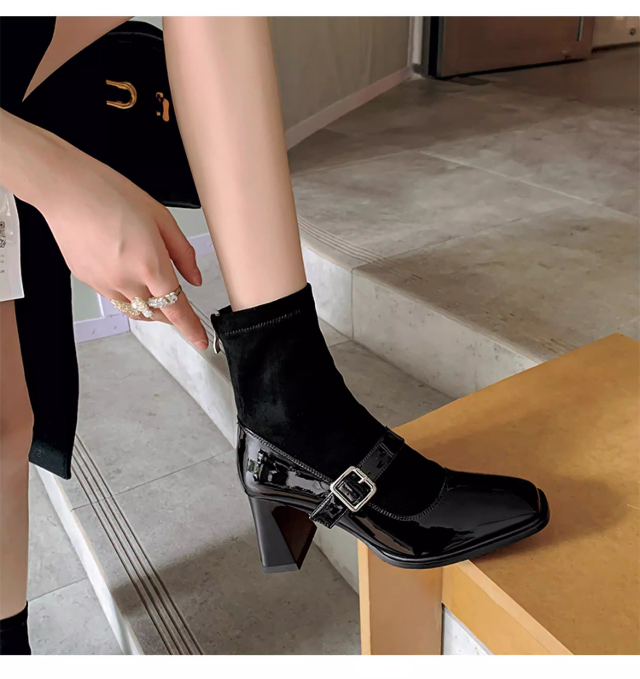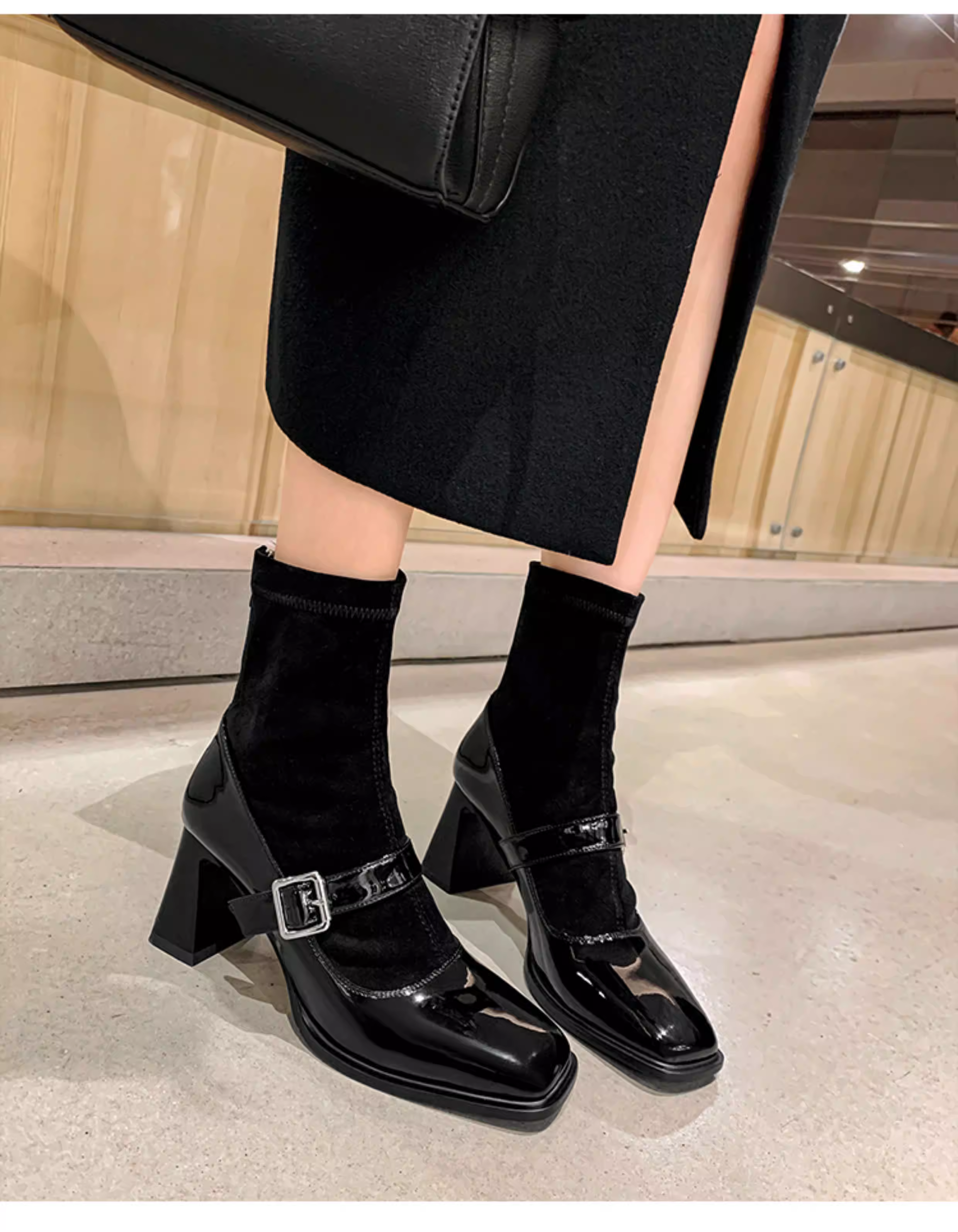- Pear Xiaoqi~ Giày bốt cao gót kiểu Pháp dành cho nữ, bốt da bóng màu đen, gót dày, bốt ngắn kiểu Mary Jane mũi vuông cổ điển.