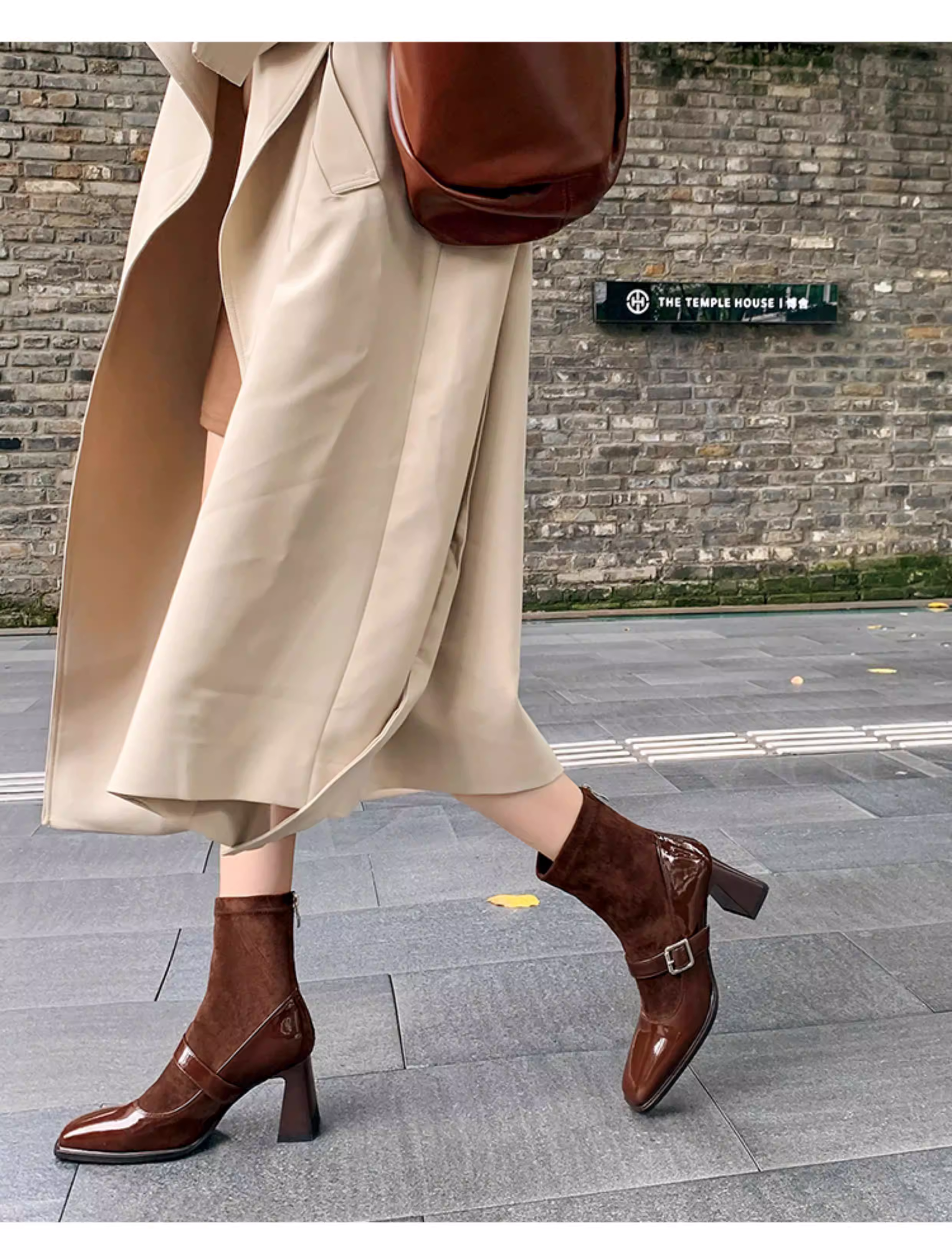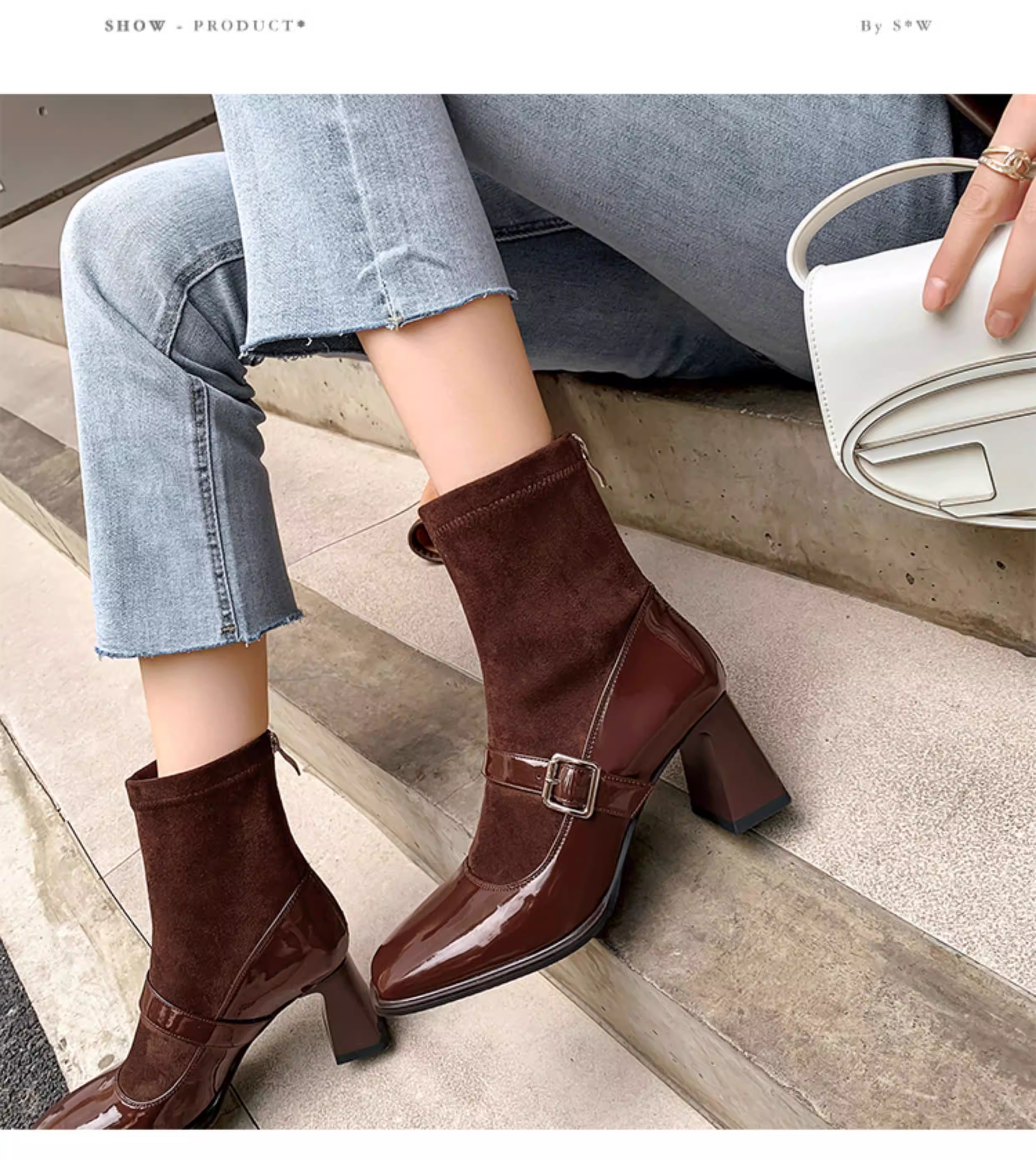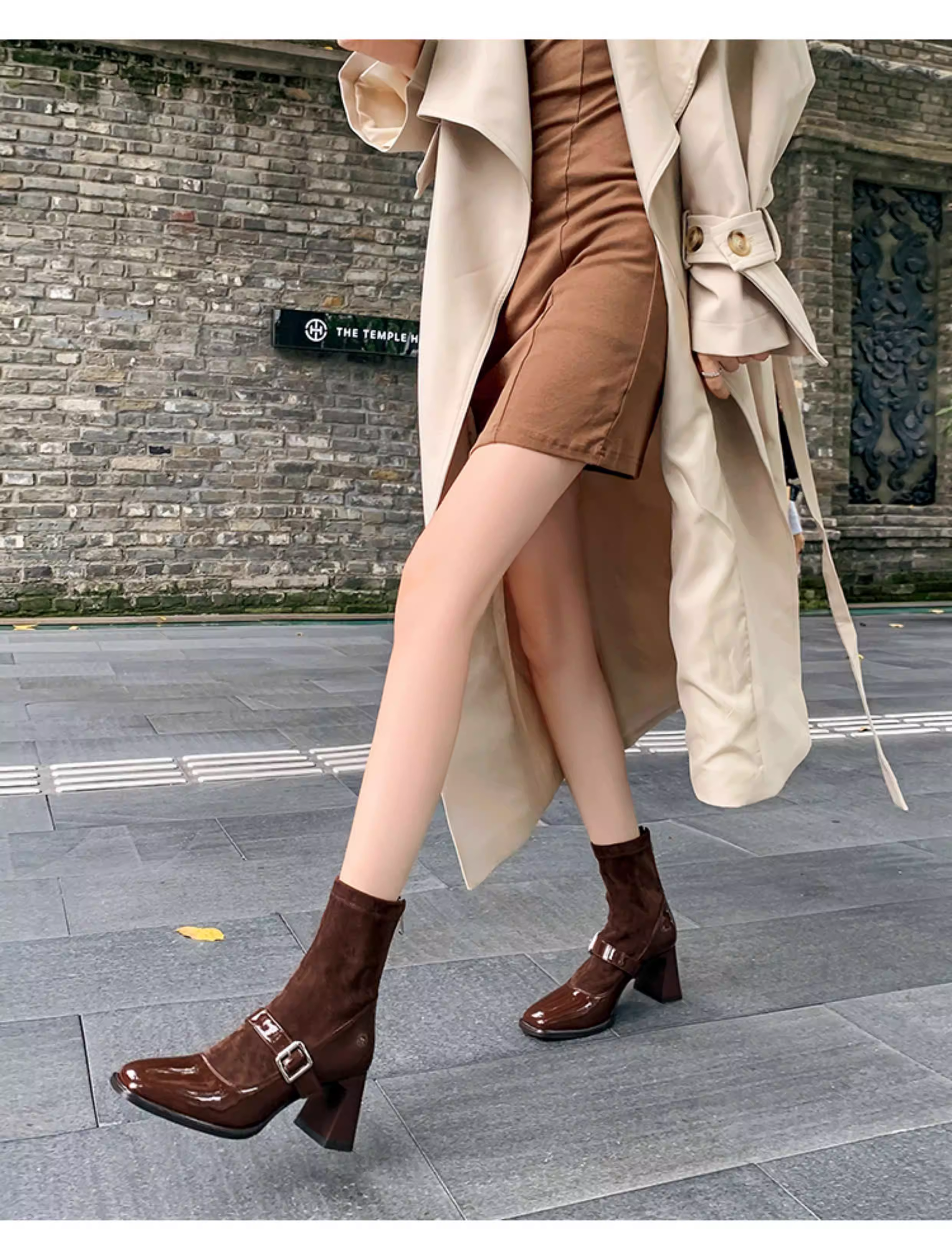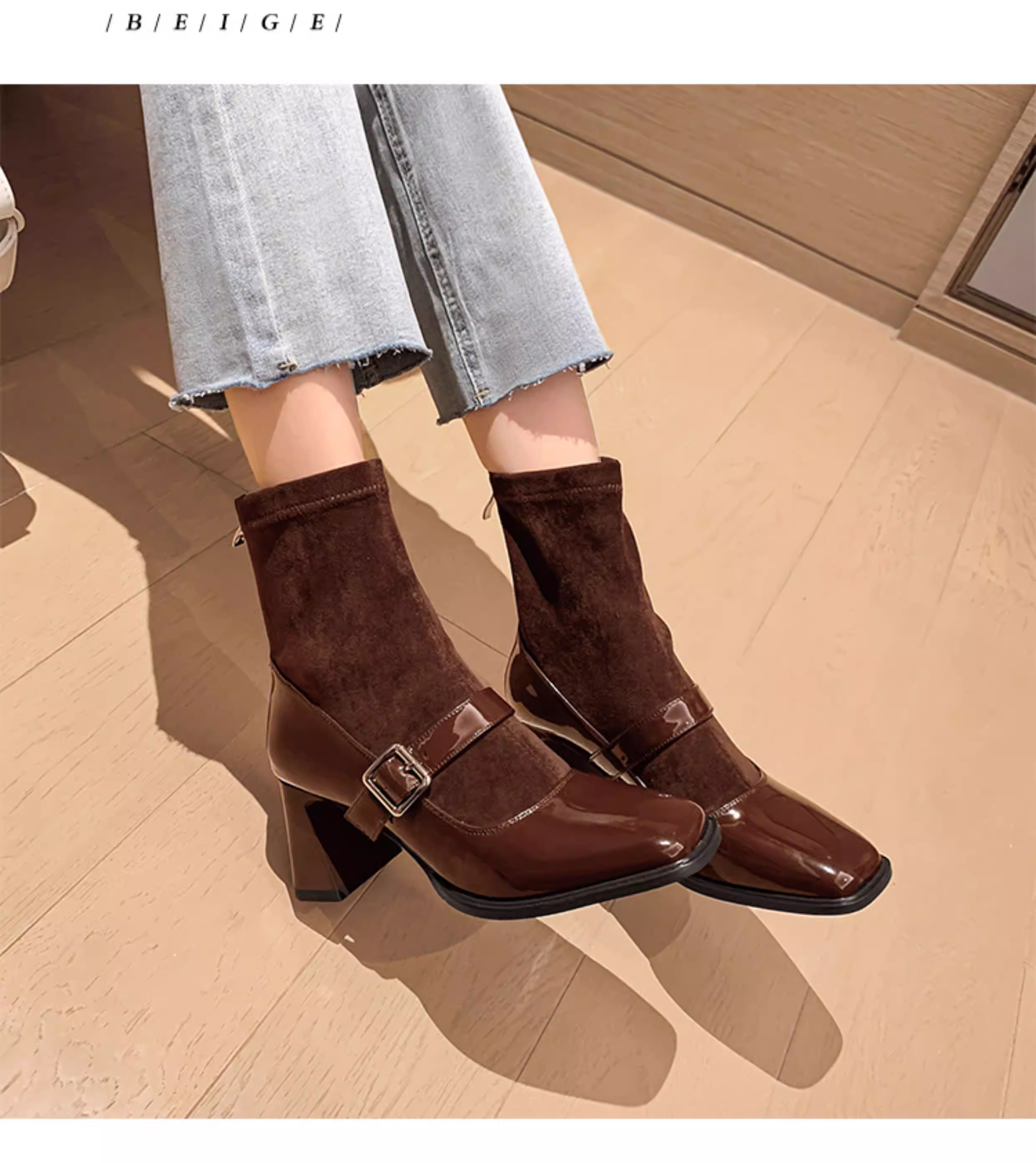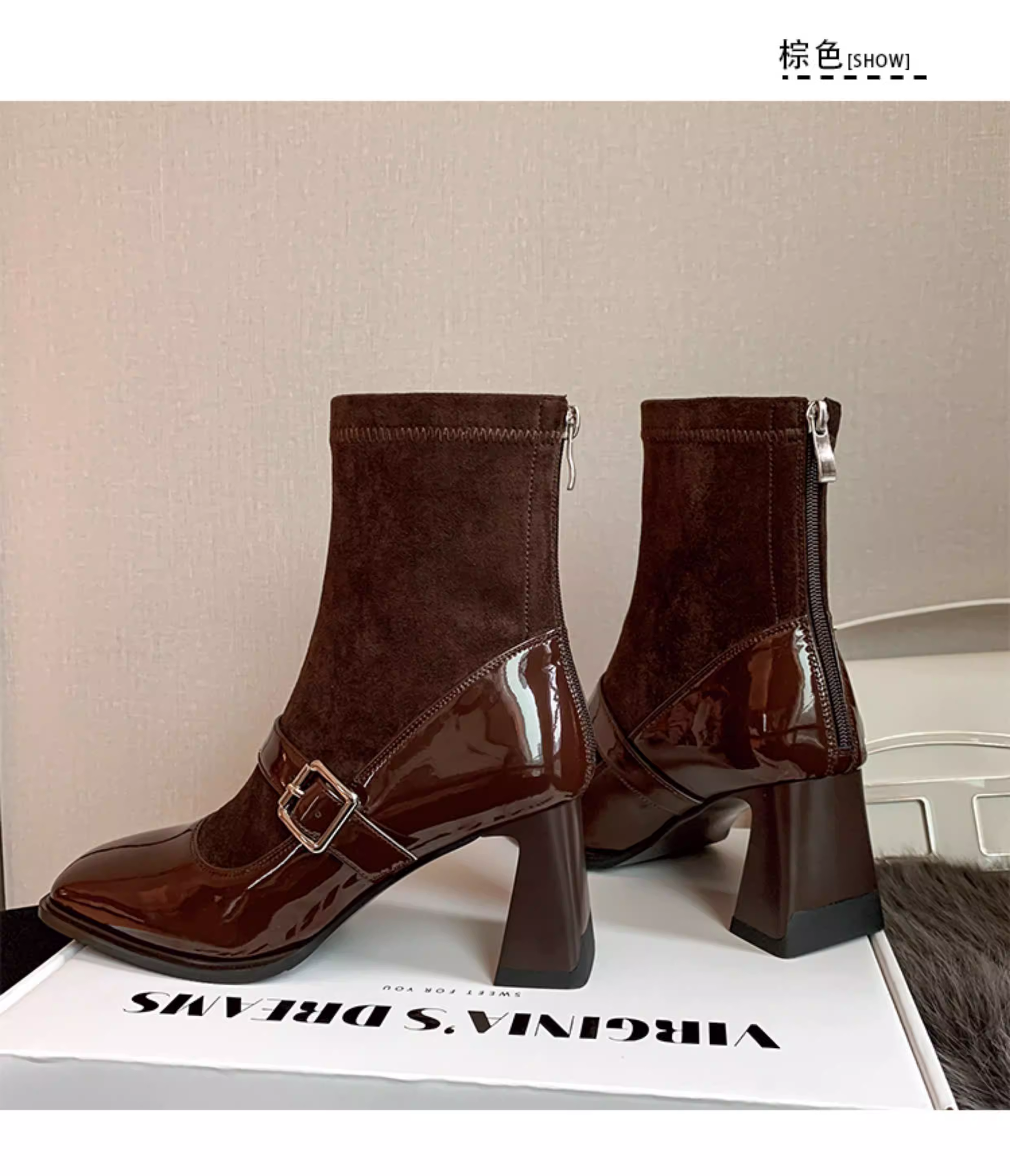 - Pear Xiaoqi~ Giày bốt cao gót kiểu Pháp dành cho nữ, bốt da bóng màu đen, gót dày, bốt ngắn kiểu Mary Jane mũi vuông cổ điển.