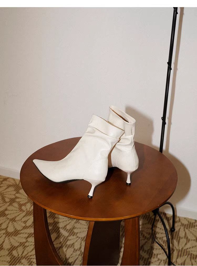 - Pear Xiaoqi~ Giày bốt cao gót ngắn màu trắng đơn giản và thanh lịch dành cho nữ, phối cùng áo khoác, da thật, kiểu dáng thời trang và giản dị.