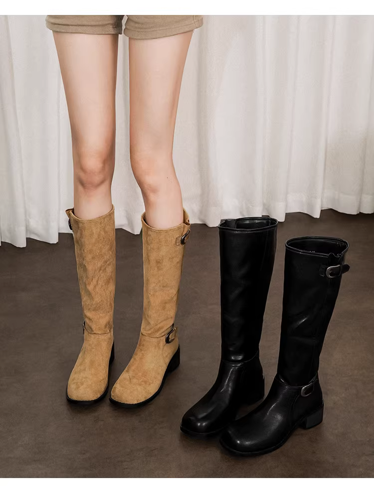 Pear Xiaoqi~ Giày bốt cưỡi ngựa đế dày bằng da thật dành cho nữ, bốt dài có khóa thắt lưng phong cách Anh, bốt kiểu phương Tây thon gọn và đa năng.
