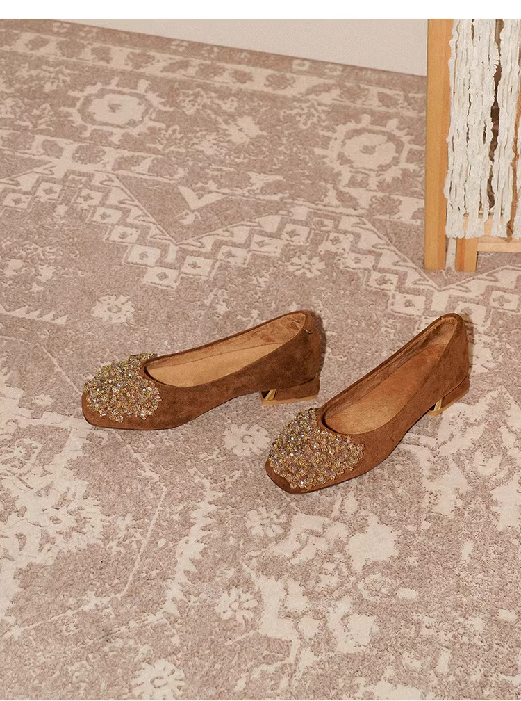 - Pear Xiaoqi~ Giày đế xuồng đính đá kiểu cổ điển dành cho nữ, giày lười da lộn kiểu cổ tích mũi vuông thanh lịch dành cho nữ