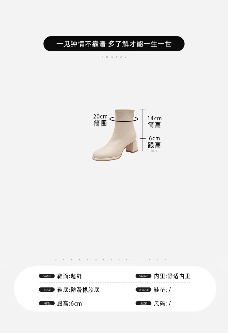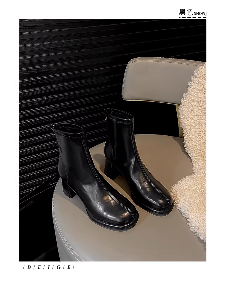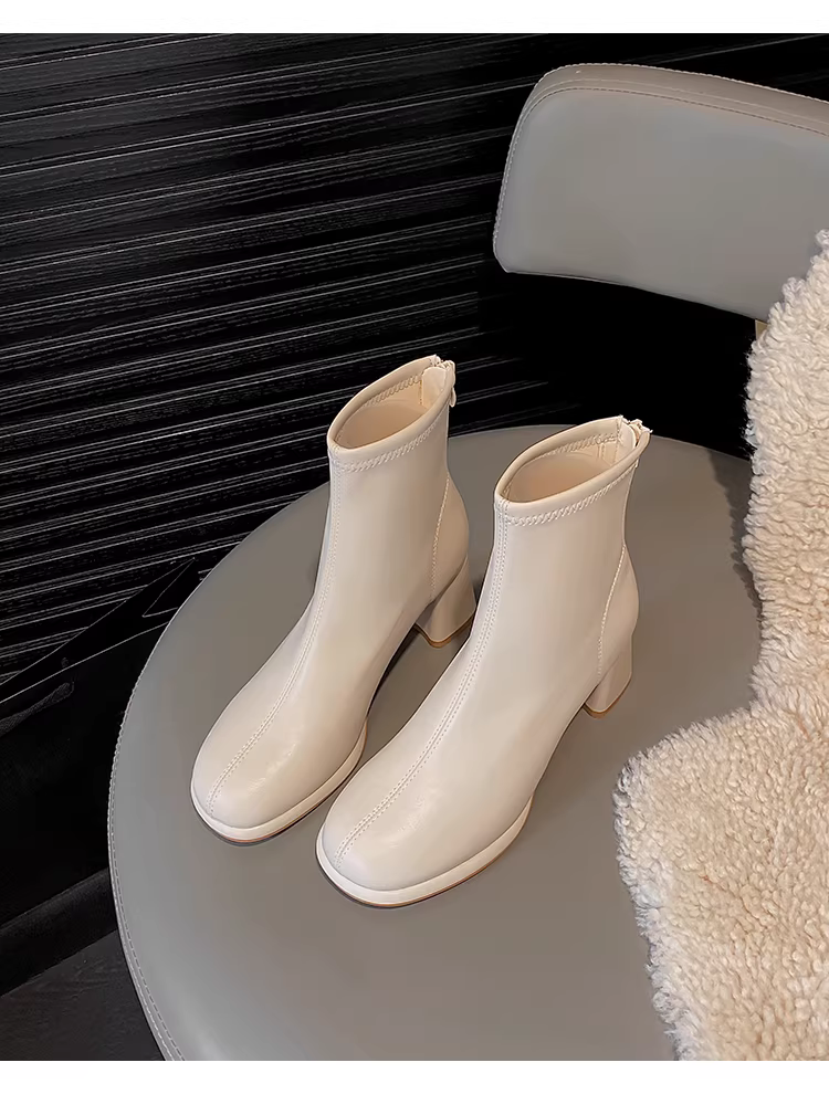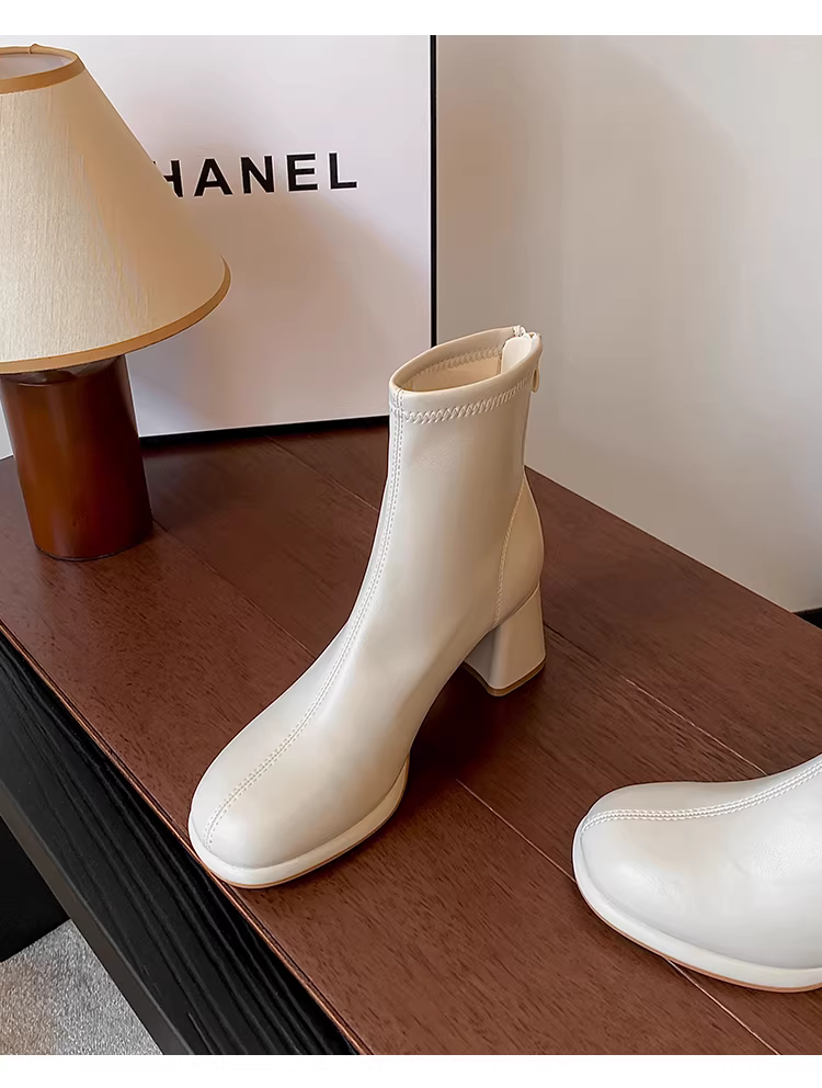 - Phiên bản da bò ~ bốt cao gót ngắn màu trắng dành cho nữ, mũi tròn, gót thô, bốt ôm dáng co giãn, phong cách Pháp, bốt Martin đa năng