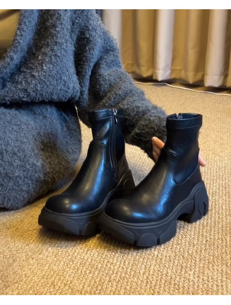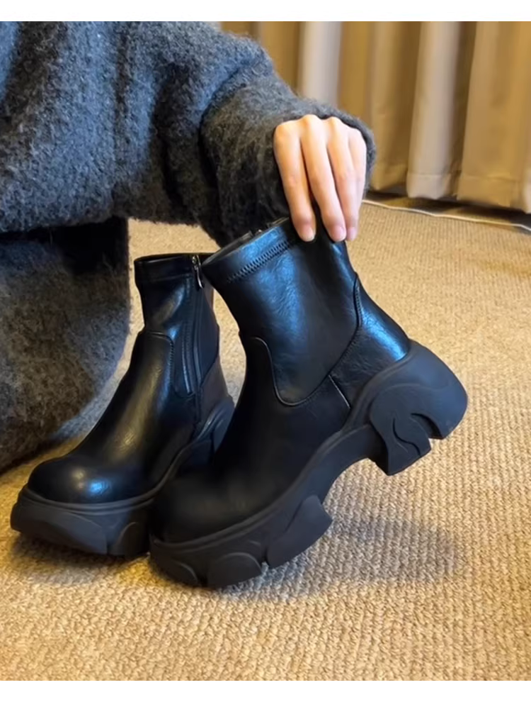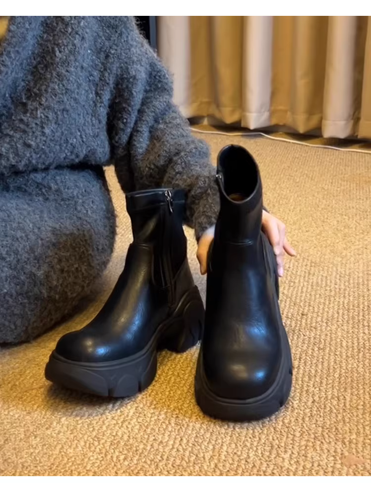 - Phiên bản da bò ~ Giày bốt bố đế dày cỡ nhỏ dành cho nữ, giày bốt Martin da thật đế dày kiểu cổ điển tăng chiều cao, giày bốt ngắn có khóa kéo thon gọn.
