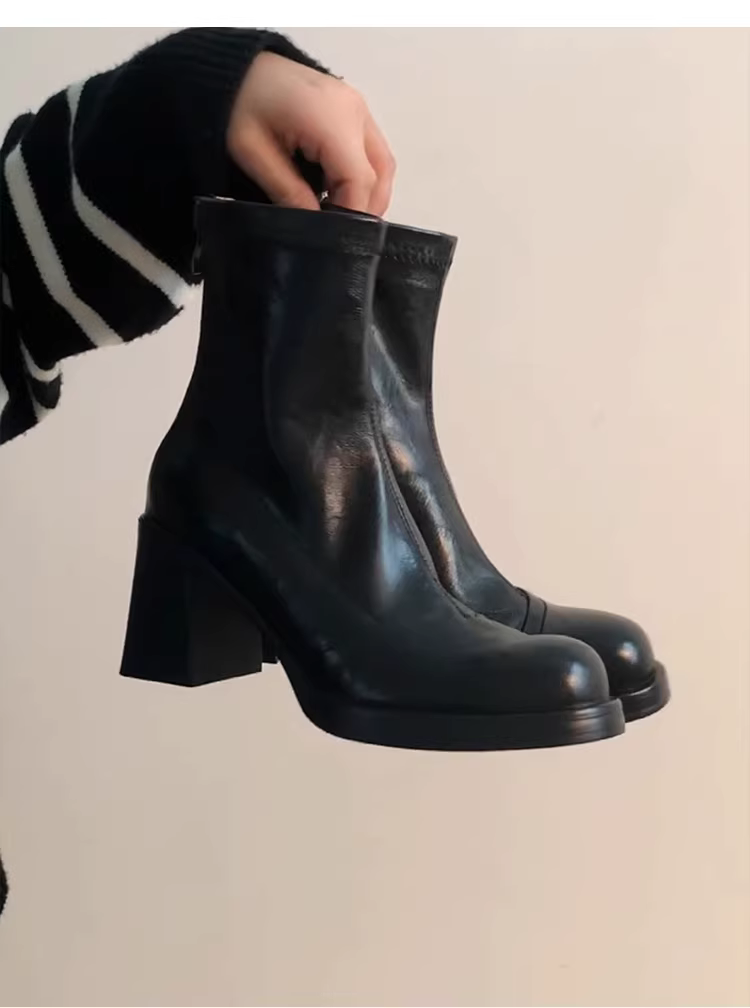 Phiên bản da bò ~ Giày bốt cao gót thon gọn co giãn dành cho nữ, phong cách Pháp có khóa kéo phía sau, da thật, bốt ngắn đơn giản và đa năng.