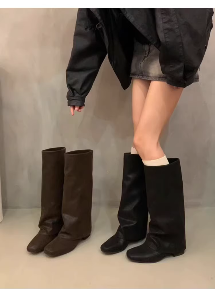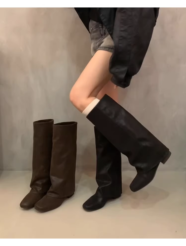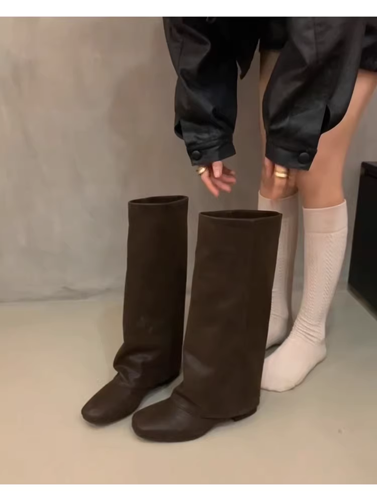 - Phiên bản da bò ~ Giày bốt cổ cao kiểu cổ điển có gót dày dành cho nữ, giày bốt mũi vuông kiểu Anh, giày bốt da thật trên đầu gối.