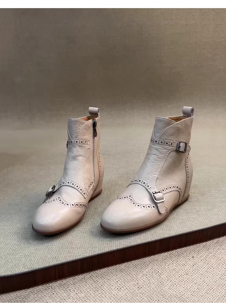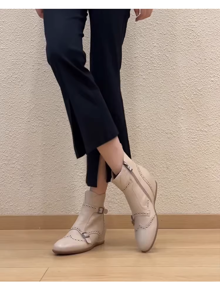 Phiên bản da bò ~ Giày bốt cổ ngắn tăng chiều cao bằng da thật kiểu Pháp dành cho nữ, giày bốt mỏng có khóa kéo bên hông thời trang độc đáo