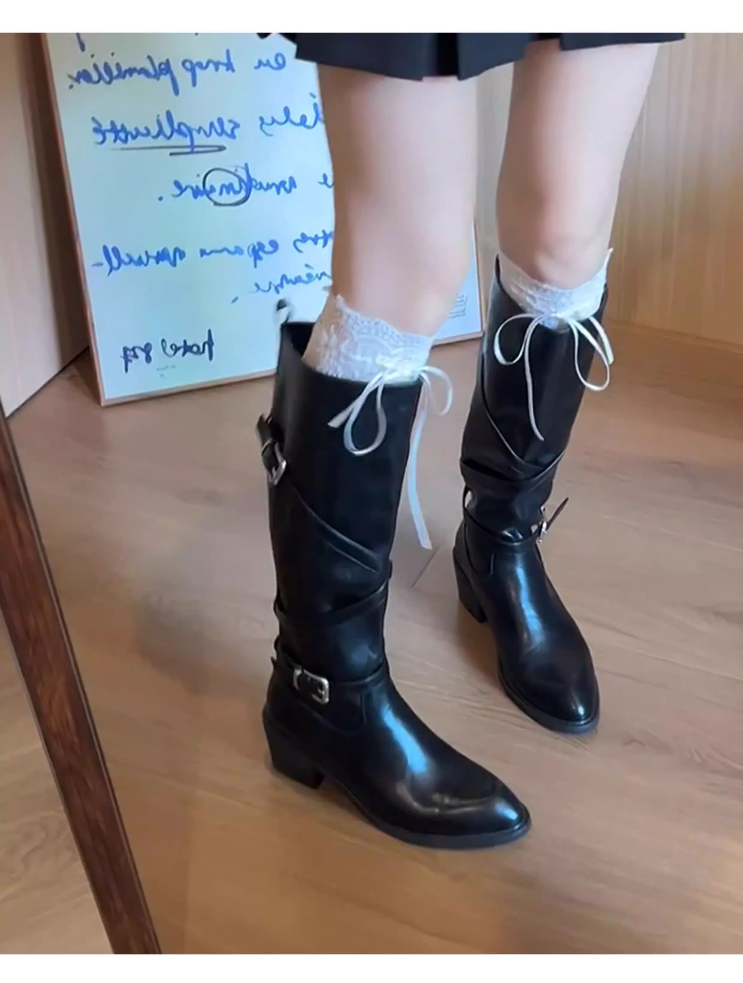 - Phiên bản da bò ~ Giày bốt cưỡi ngựa da thật đế dày cổ điển dành cho nữ, thân rộng, dây đeo khóa chéo, mũi nhọn, bốt biker cao quá đầu gối