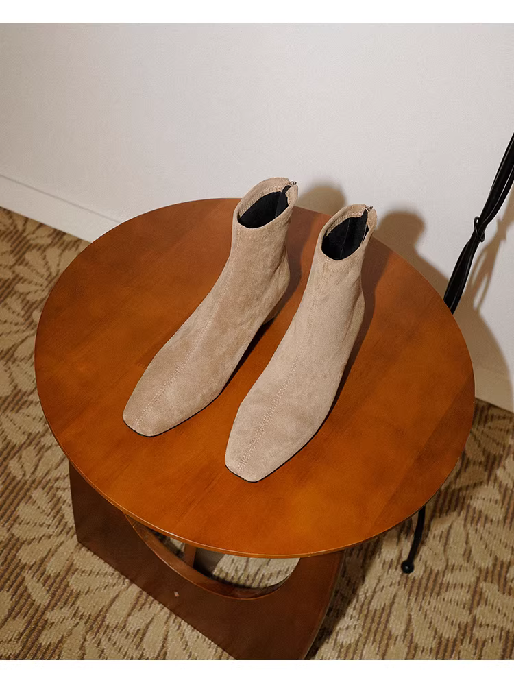 - Phiên bản da bò~ Giày bốt da lộn mũi vuông kiểu cổ điển của Pháp dành cho nữ, phong cách thu đông mới, gót dày, thon gọn, đa năng, bốt ôm dáng co giãn