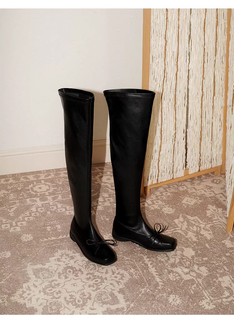 - Phiên bản da bò ~ Giày bốt da thật cao quá đầu gối kiểu ballet dành cho nữ có nơ, mũi vuông, giày cao cổ màu đen thanh lịch và tôn dáng