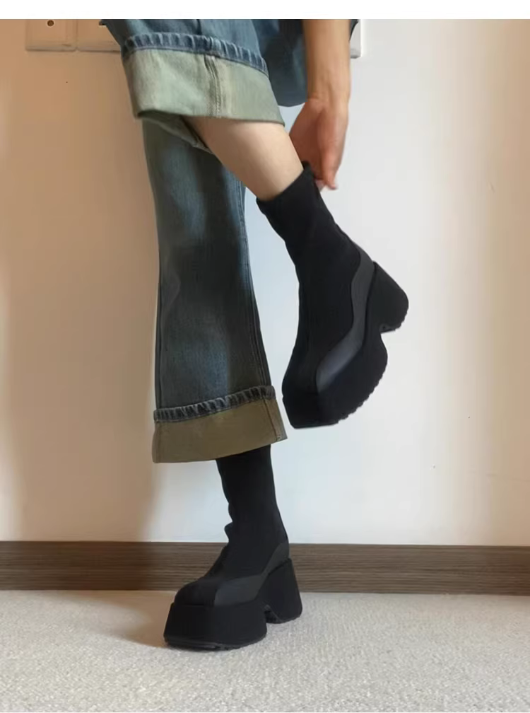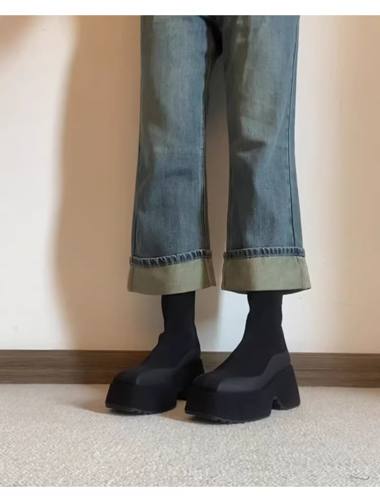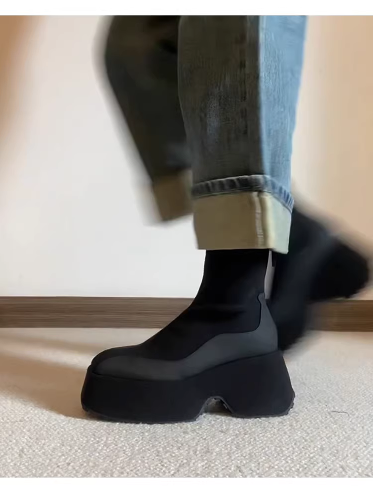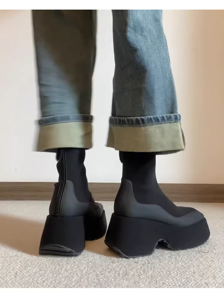 - Phiên bản da bò ~ Giày bốt da thật đế dày co giãn dành cho nữ, giày bốt cổ ngắn phối màu mũi vuông tăng chiều cao, giày bốt Martin